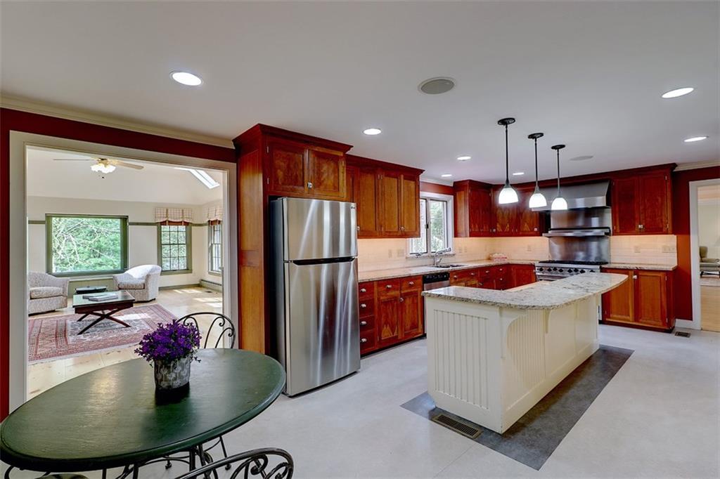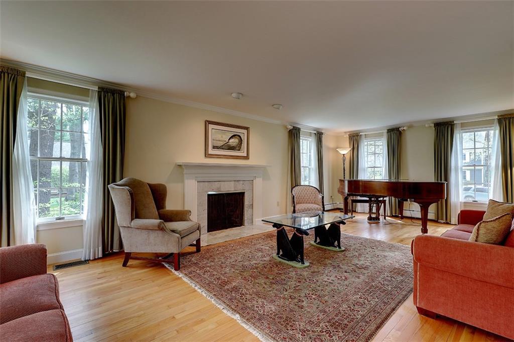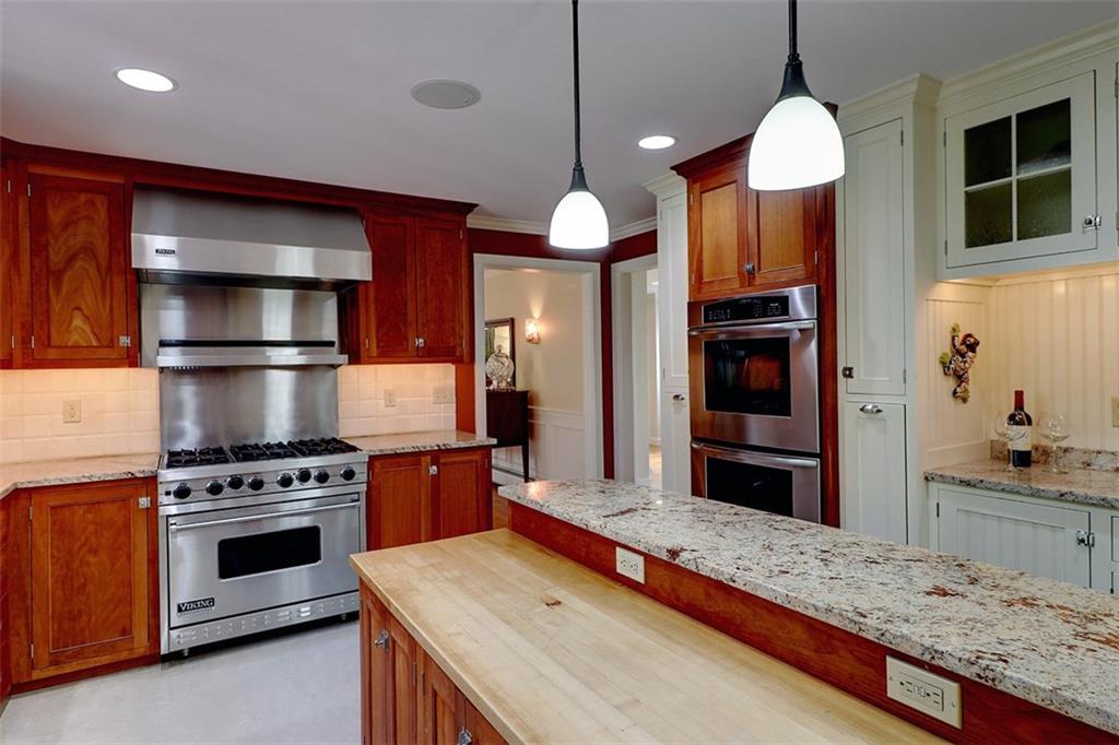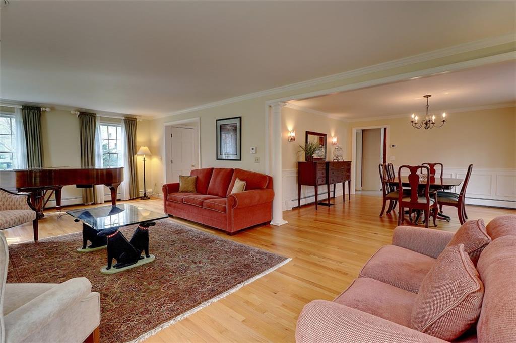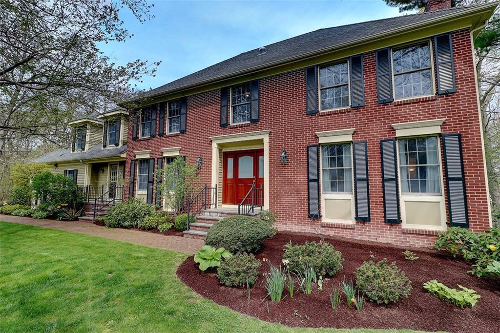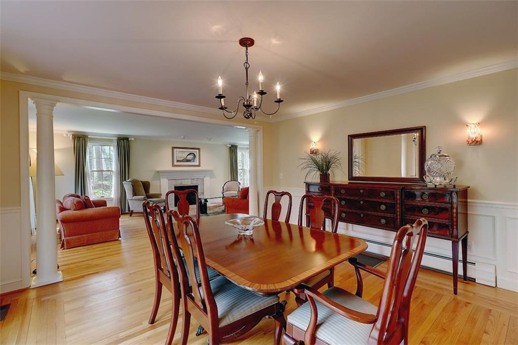 This stately Georgian colonial sits on over an acre of gorgeous manicured grounds and abuts conservation land! With gleaming hardwood floors, this elegant home has a large formal living room which flows directly into the adjacent formal dining room. Picture frame moldings, crown moldings, custom columns and French doors add an element of sophistication to these rooms. The eat-in chefs kitchen is an entertainers dream with its abundance of custom cabinetry, large center island, granite countertops, and high-end stainless appliances. Cook or bake your heart away with its Viking stove and two additional wall ovens! Adjoining the kitchen is the large sun-drenched family room which overlooks the extremely private rear yard.