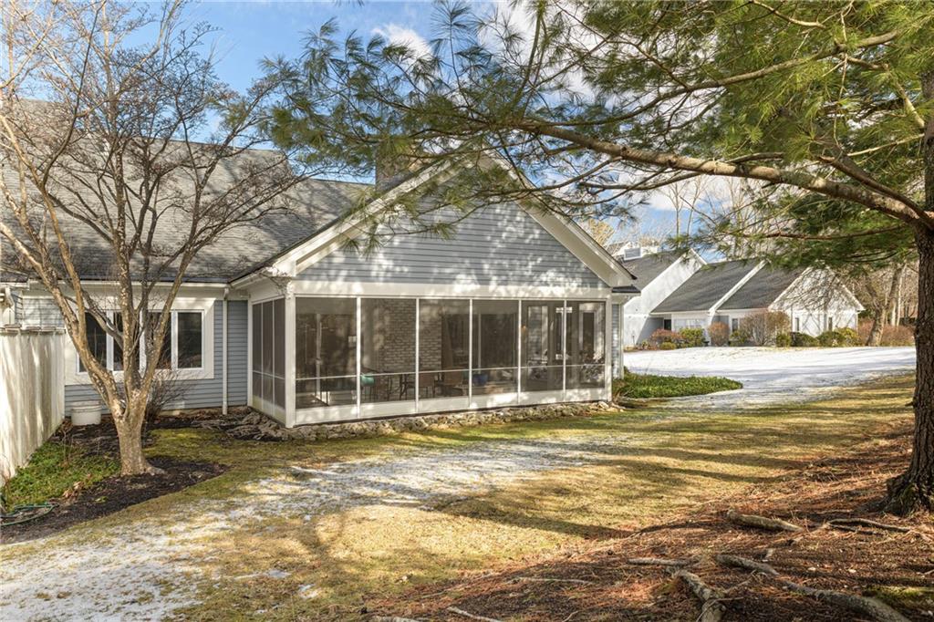 Welcome to this single level pristine condominium at Bagy Wrinkle Cove.The residence’s soaring ceilings and open floor plan greets guests as they enter. Open kitchen and dining offer great entertaining space . On each side of the living room fireplace are sliding glass doors which let in abundance of natural light and lead to a three-season porch. Tucked off the kitchen is a den or home office with built-in custom shelves.