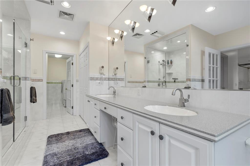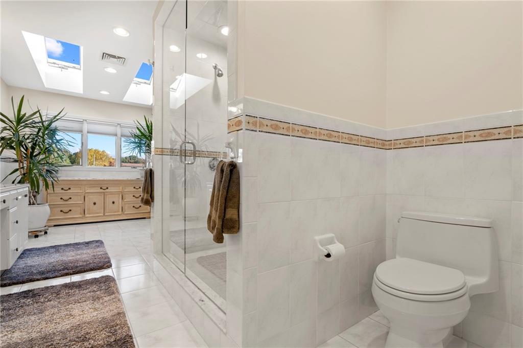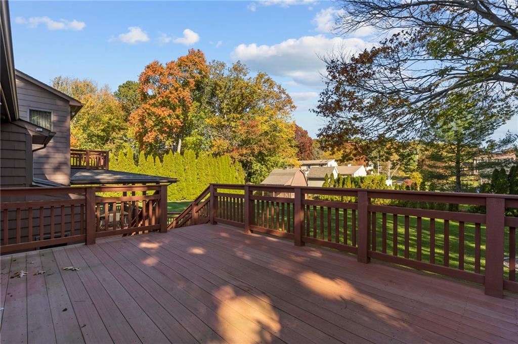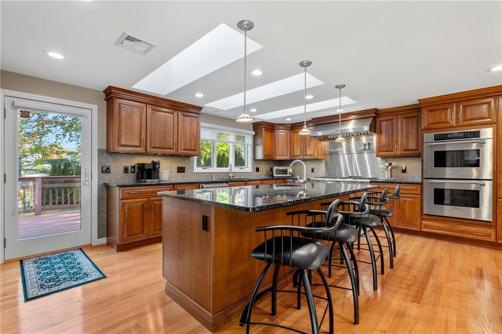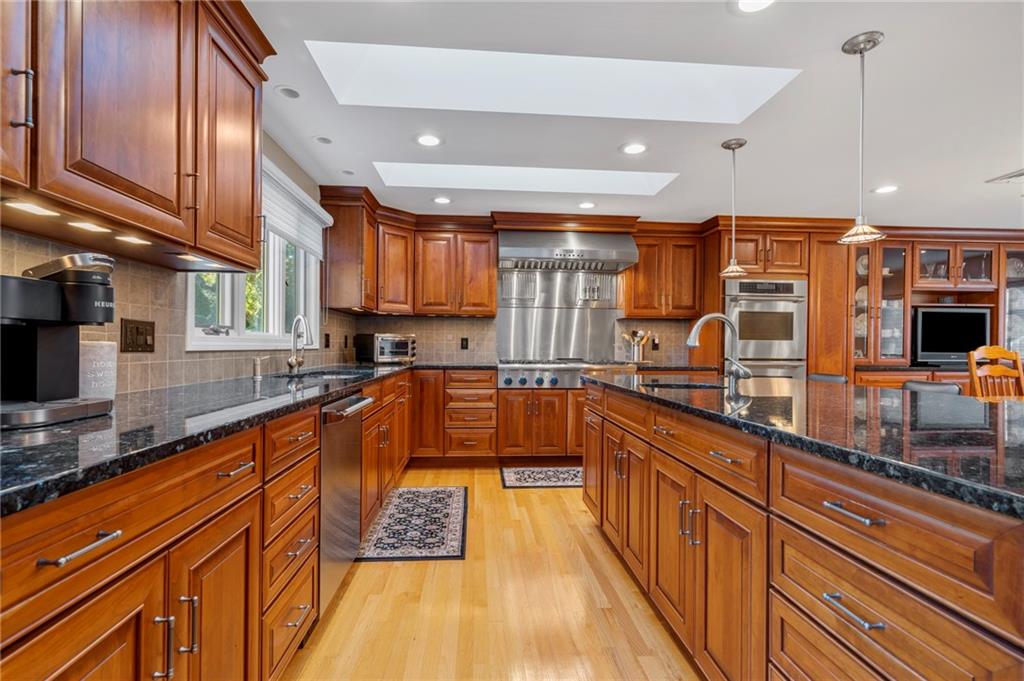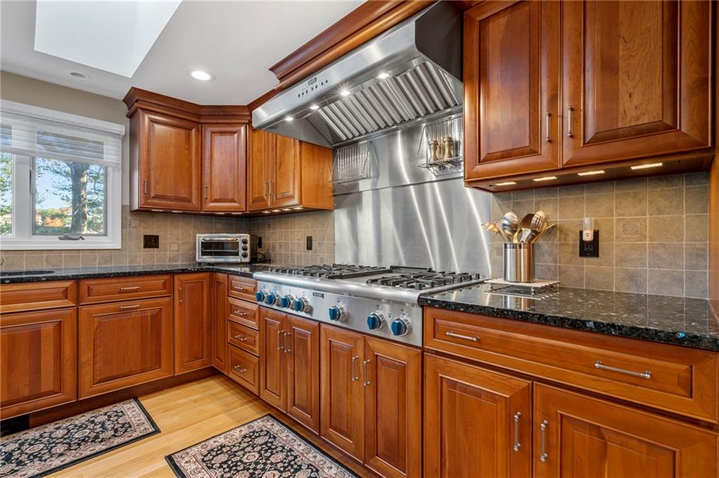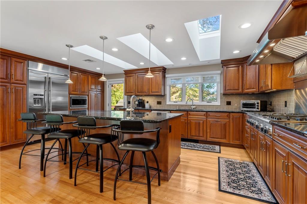 The basement features more functionality with partial kitchen, family room & Wood Stove, 1/2 bath, and separate room that can be office/playroom. On the main living level is a luxurious, custom designed, gourmet kitchen flanked with Thermador appliances, oversized island, and custom built-ins. There are 3 BR on this level with one serving as Main BR with access to full bathroom. One of the BR currently serves as a fully outfitted office. An oversized Master BR Suite was added above the garage where privacy and luxury abounds. The tiled spa like bath features double vanity, walk-in shower, and 2 walk-in closets. Off the bathroom is the laundry room. The flat and functional yard is fully fenced in with multiple Trex decks, garden shed,& lawn irrigation. Utilities are natural gas, 200 amp electrical, Generac generator, Central Air, Weil McLean boiler, Alarmed, Public Water. The list is endless of what this home has to offer. Ready to go just in time for the holidays!