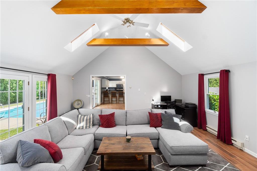 Welcome to this well maintained 3 bed, 2 1/2 bath cape cod style home! Perfectly sited on a 1/2 acre lot with fenced in back yard and sparkling in-ground pool. This home offers ample space to entertain indoors and out. The family room with cathedral ceilings and wood burning fireplace is a must see! Settle in and open the doors to receive fresh air in the warm months and light the fire as the nights get chilly to enjoy this space to its fullest potential. with an amazing family room.