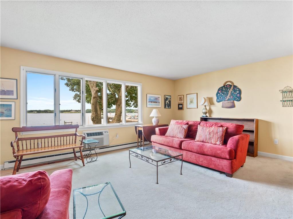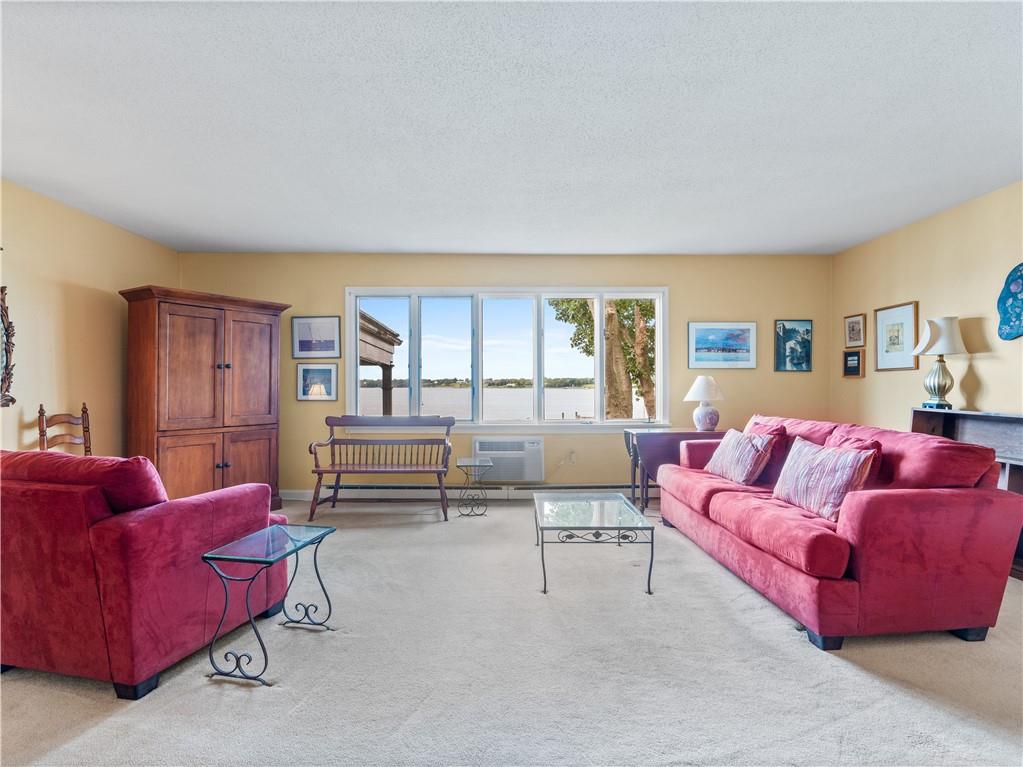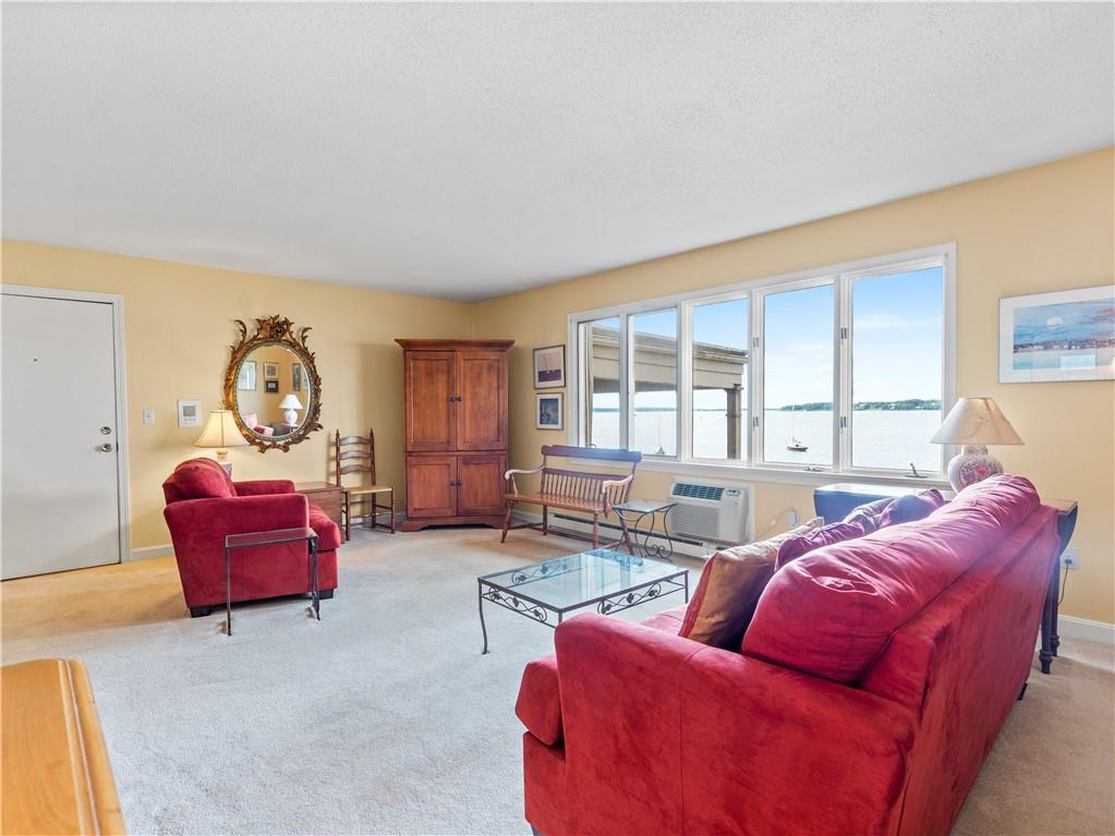 Sundrenched interior features absolutely gorgeous views from the living room and primary bedroom. Layout offers simple one level living with a spacious open concept. This end unit is located on the main floor just steps from the waterfront back entrance of the building. Enjoy the shared cozy back patio and expansive green lawn overlooking the Harbor and sun lit skies.