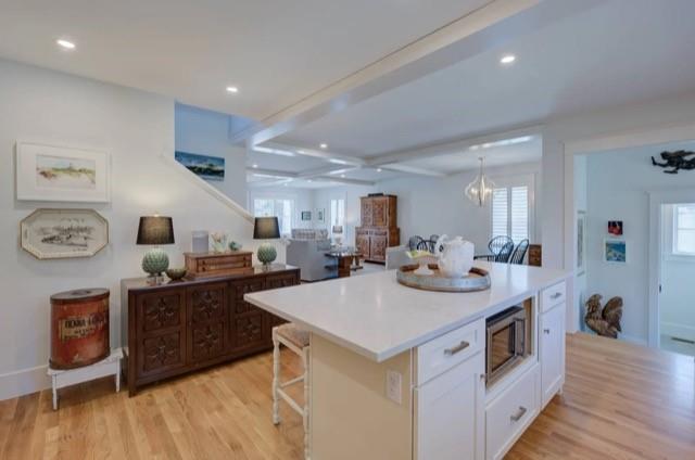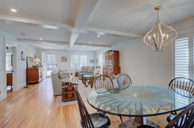 Built in 2021 by Paul R. Doherty with design by architect Scott Weymouth, this shingled beach colonial will impress with it’s high quality and high end finishes. The inviting covered mahogany front porch welcomes you in while the bright, modern and stylish interior keeps you there. Lovely hard wood floors and high, coffered ceilings provide the bookends to the beautiful interior in-between.