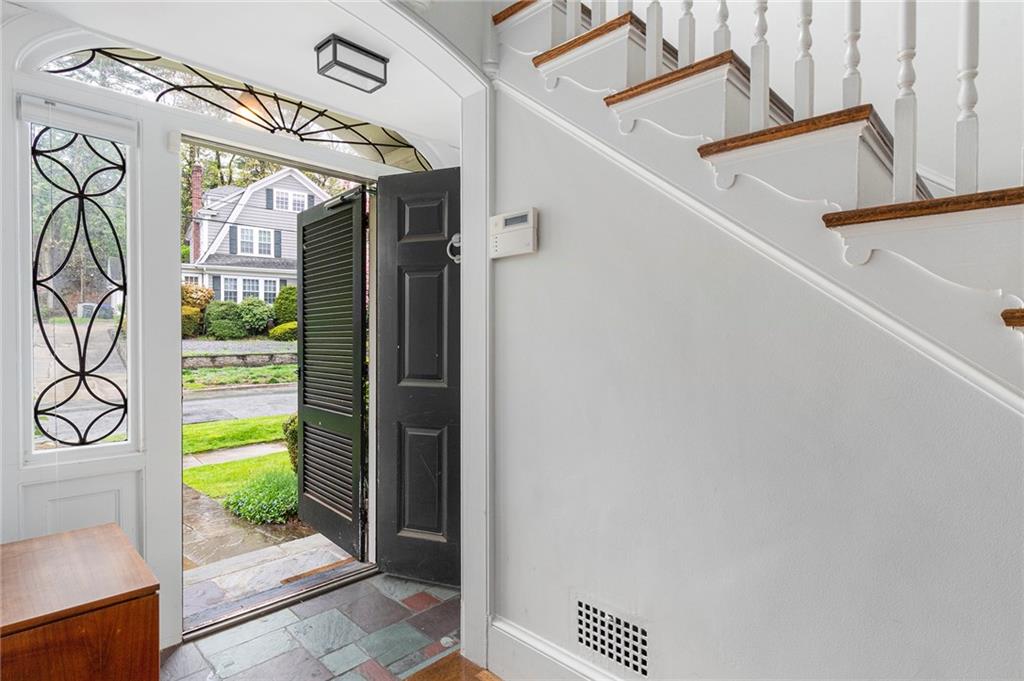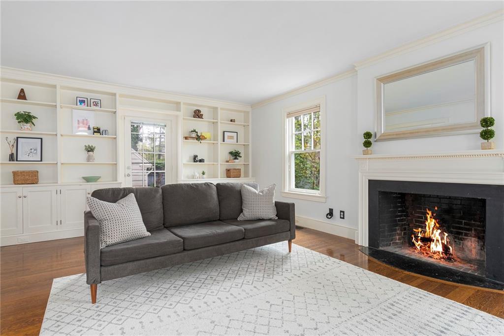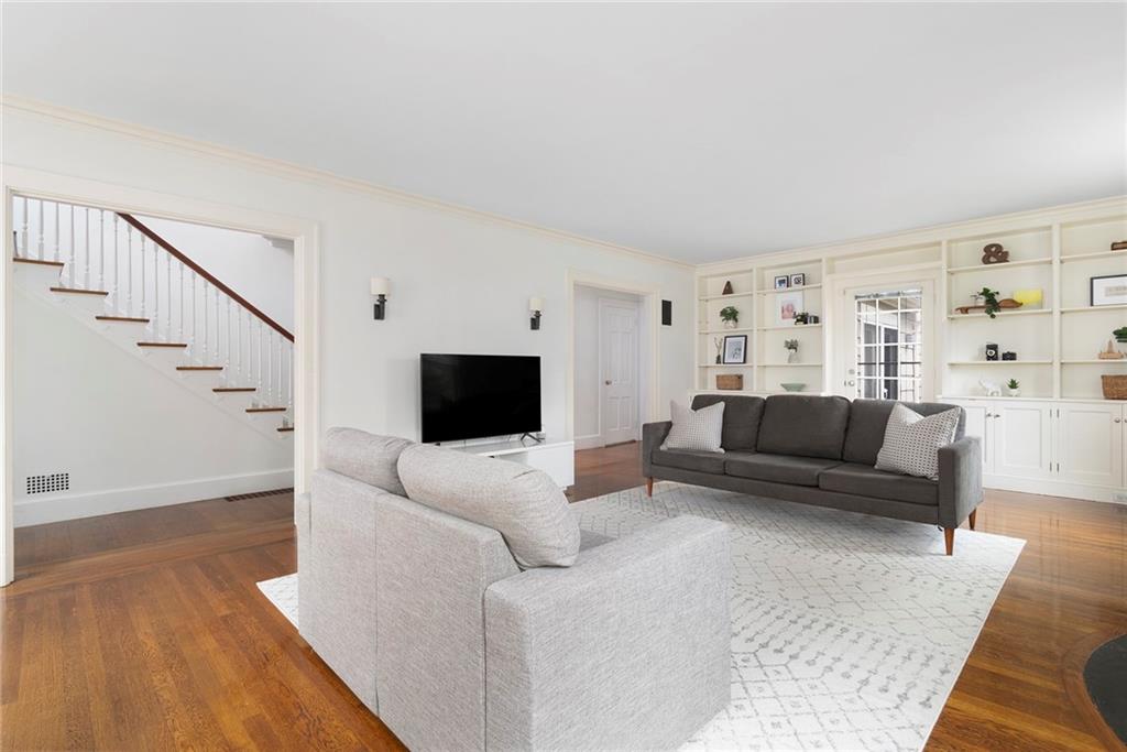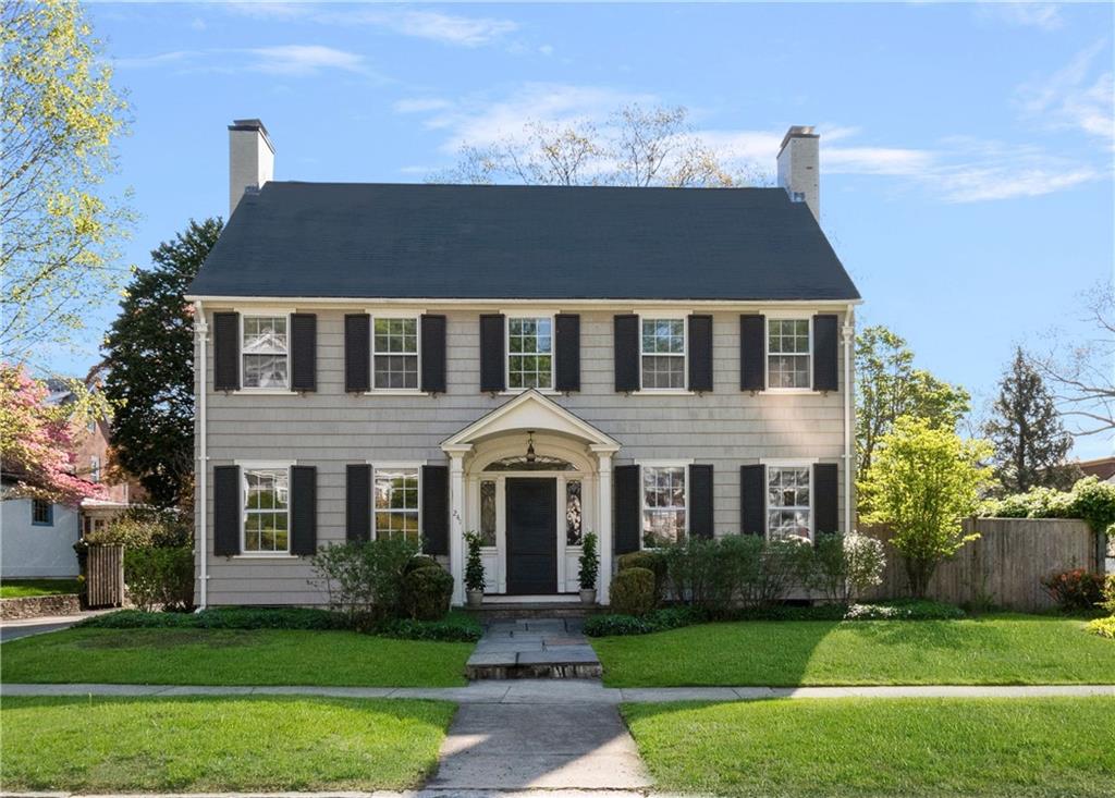 An exceptional Freeman Plat Colonial, this elegant home offers tasteful design and a layout perfect for today’s living. The foyer connects to a large, sun-splashed, fireplaced living room with tall built-in bookshelves and crown molding. Nearby sits a vaulted-ceiling sunroom. Both engaging spaces enjoy walkout access to the rear patio and fenced yard with mature trees for privacy.