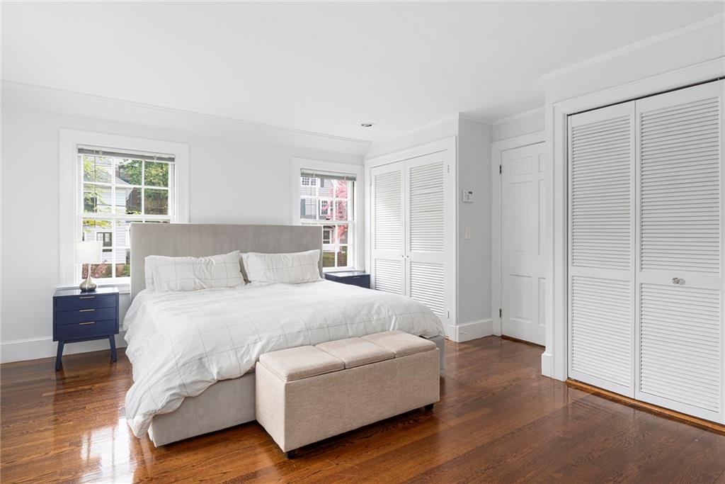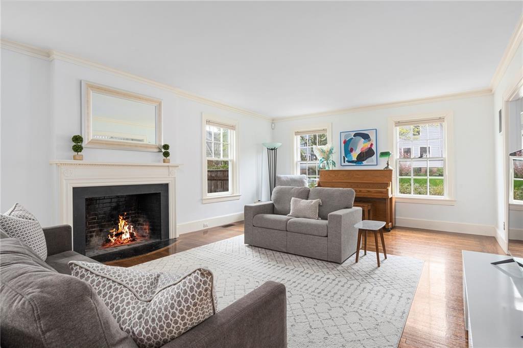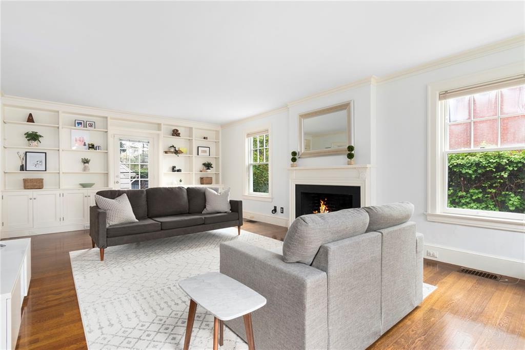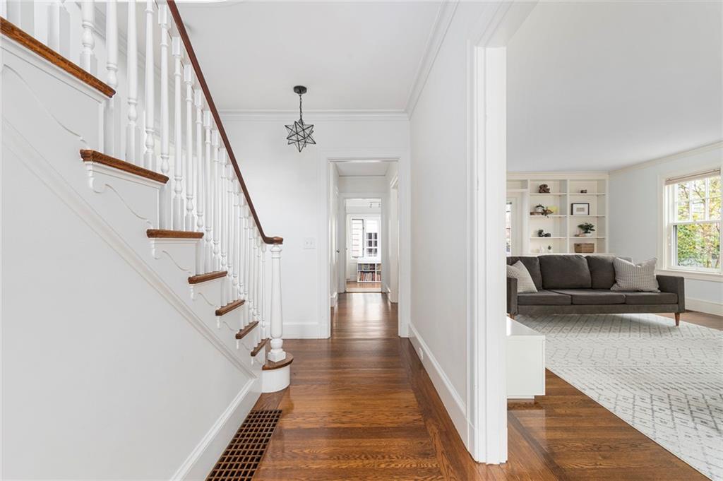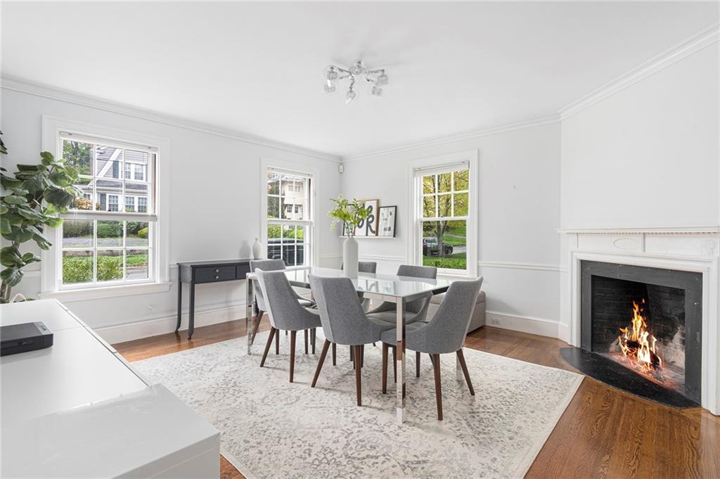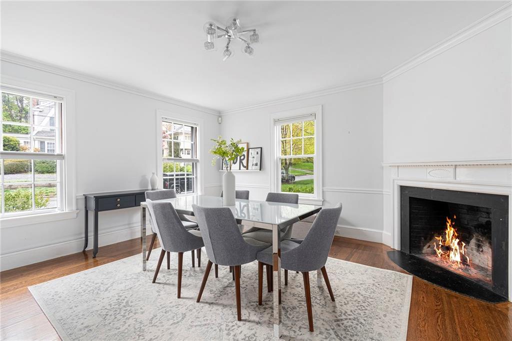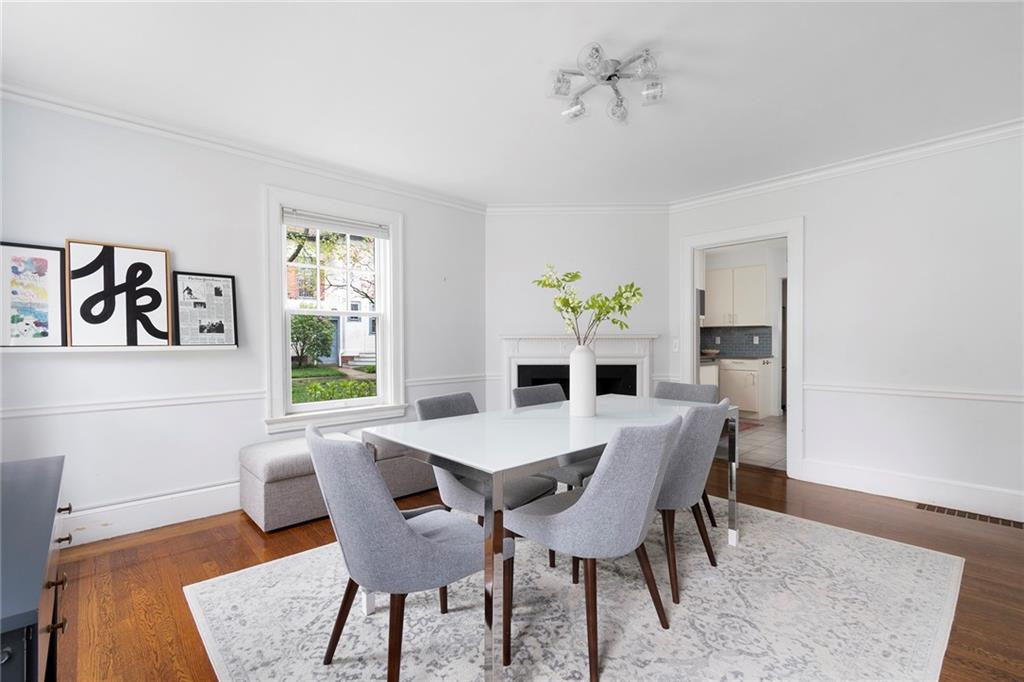 A mudroom area creates a nice transition from the exterior to the charming eat-in kitchen with stainless steel appliances, followed by the fireplaced dining room. The second floor continues the crisp style, as hardwood floors accent a lovely primary suite with an ensuite bath and double closets. Two bedrooms with sun streaming from windows on two sides are served by a full hallway bath. The third floor offers more fresh, bright, easily customized space with an additional bedroom, the perfect home office/zoom room and full bath. Central AC and a 2-car garage complete this ideal East Side home. The fabulous location allows for shopping or dining at nearly Wayland Square or visit the boutiques and restaurants along Hope St. and Thayer St. Walks along Blackstone Boulevard, Lippitt Park, and the waterfront of India Point Park add natural splendor, while the train station and downtown PVD are minutes away.