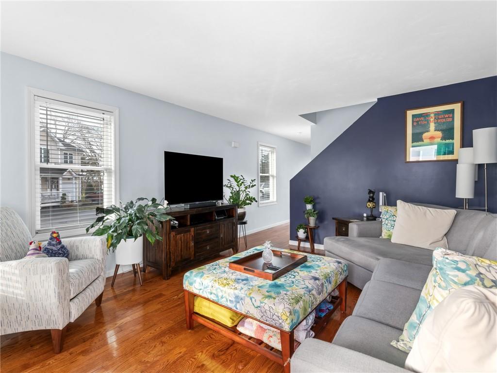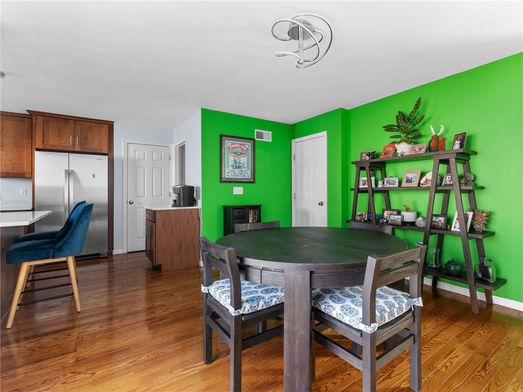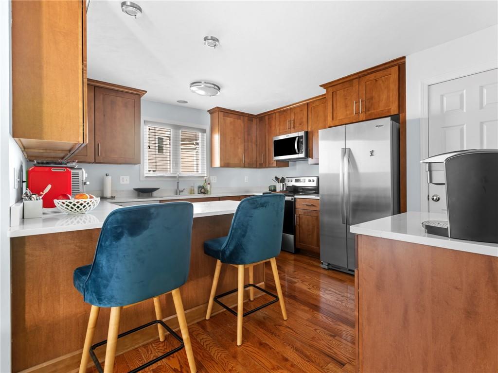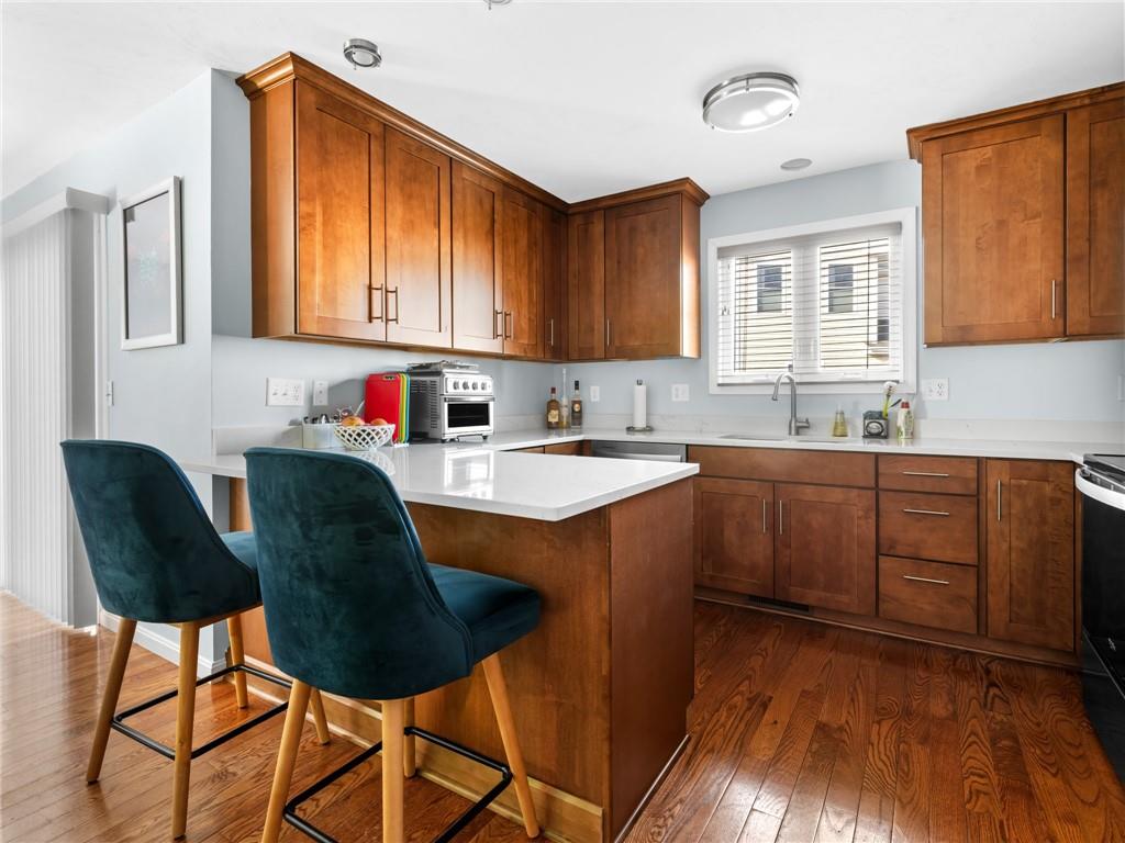 An inviting front porch welcomes you to this charming townhouse-style end unit condo. Flowing throughout the main level are beautiful hardwood floors, connecting the comfortable living space with an open kitchen and dining area. The kitchen is brand new with quartz countertops, stainless steel appliances, modern and clean elements, and convenient counter seating. A sliding glass door opens out to an elevated rear patio, perfect for outdoor dining and enjoying the warm weather.