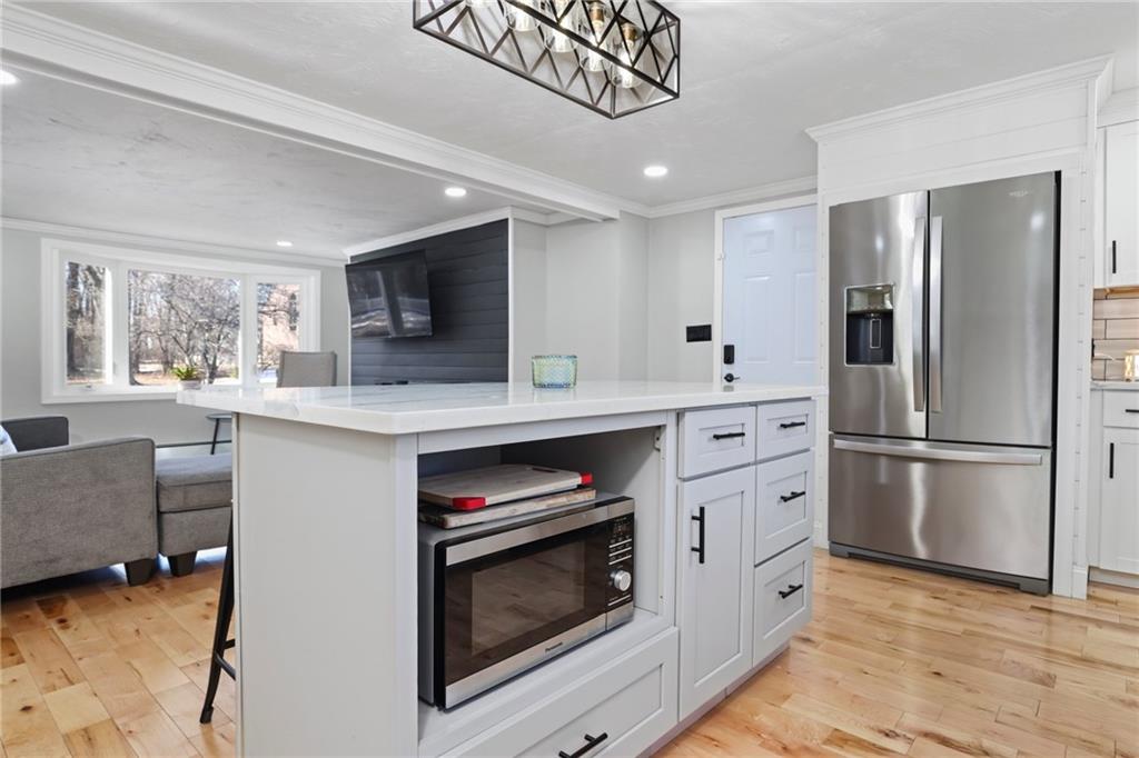 Step inside and be greeted by gleaming hardwood floors that flow throughout the spacious open concept living area. The heart of the home is a chef’s dream kitchen, perfect for gatherings both large and small. Imagine cozy evenings spent by the fireplace, framed by a striking shiplap accent wall, in the adjacent living room.