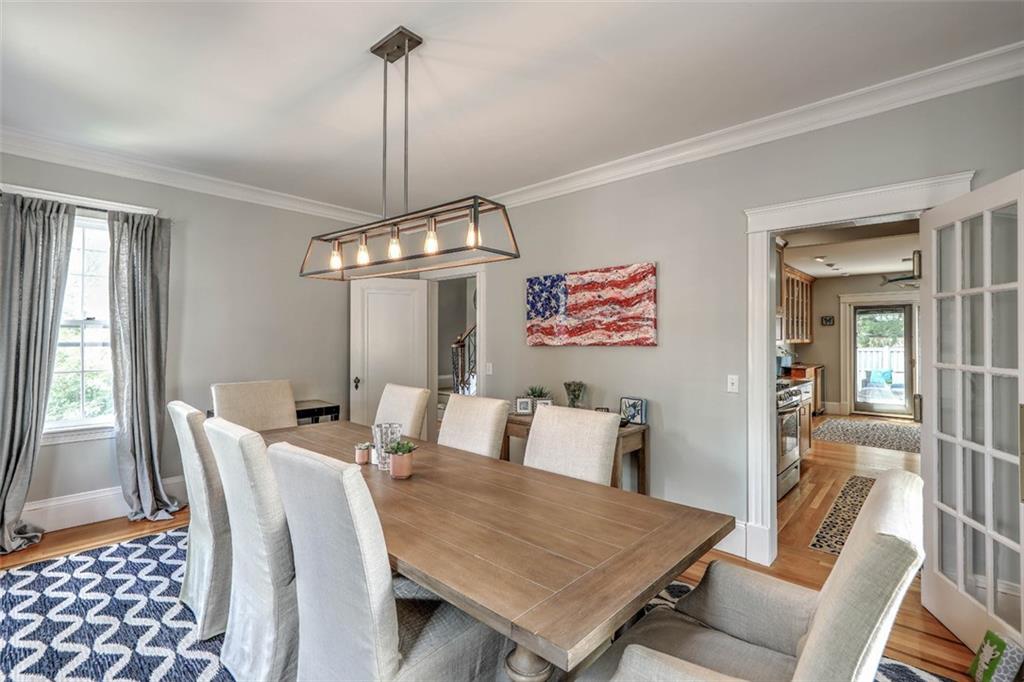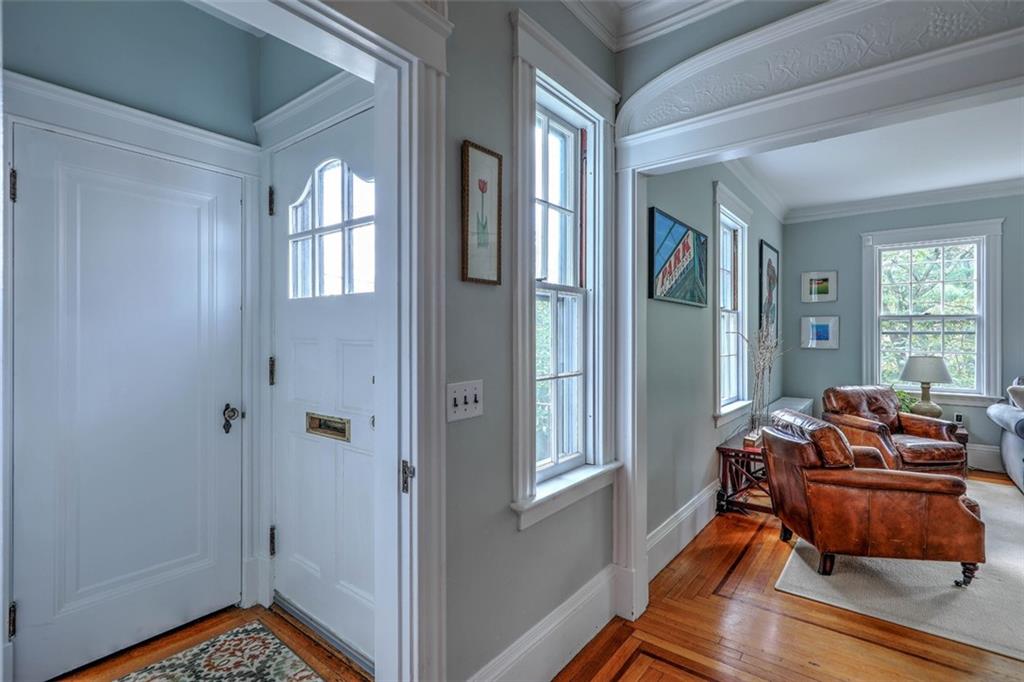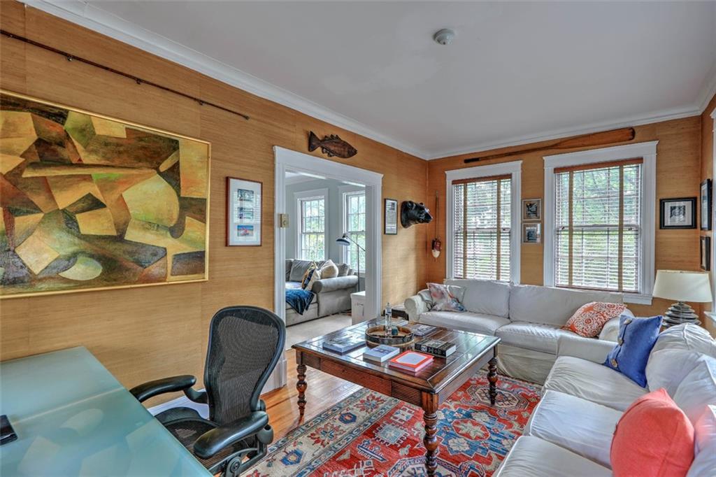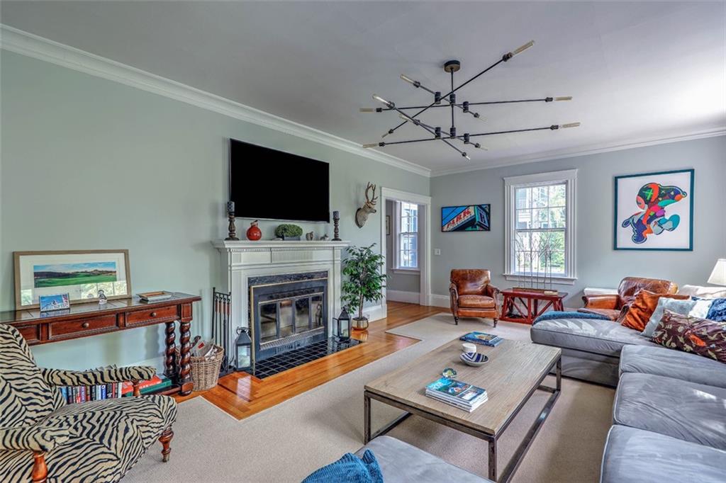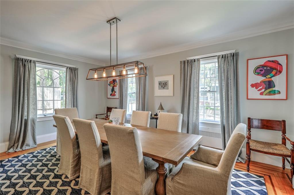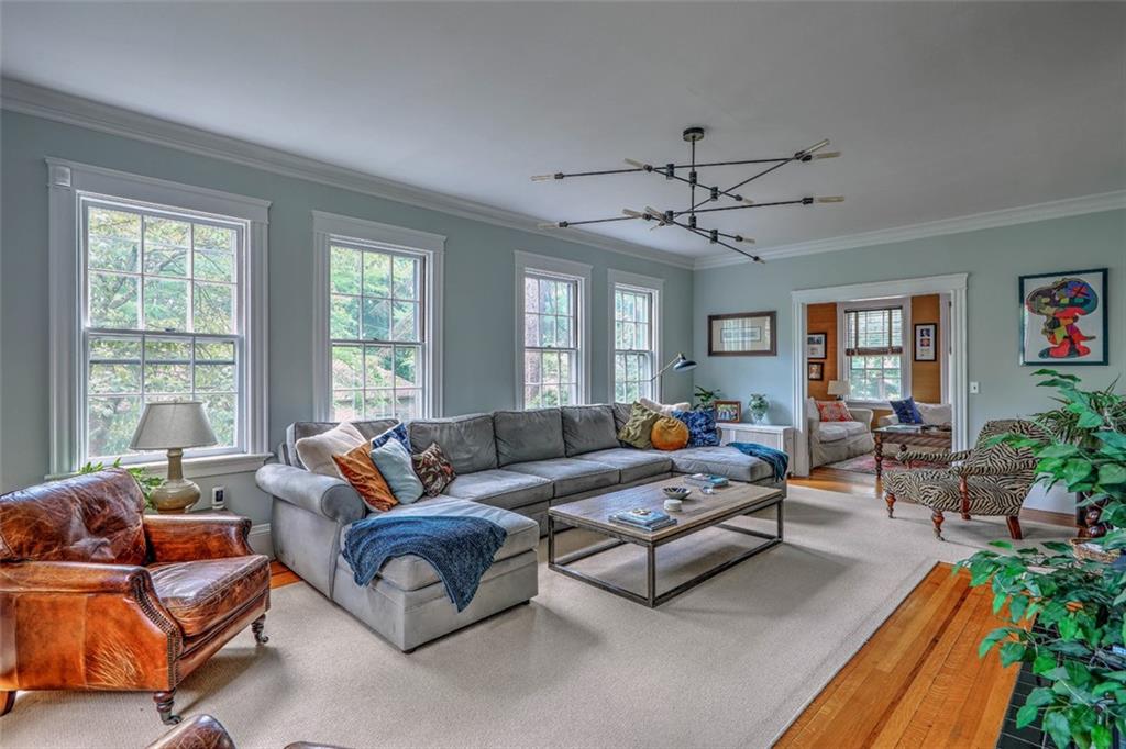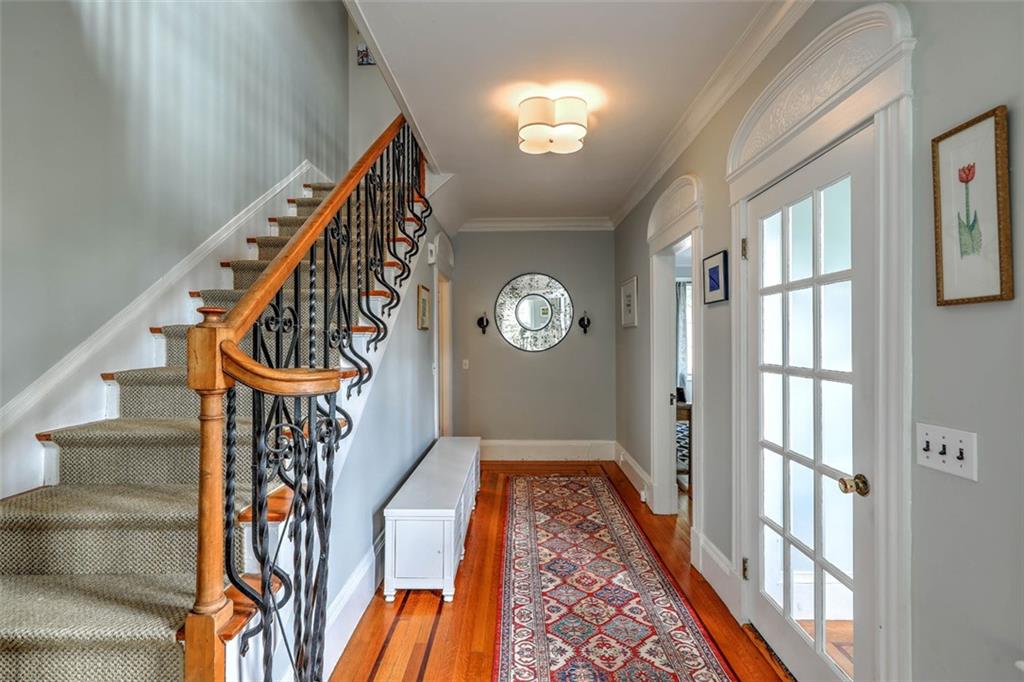 Located on Abbottsford Court, a quiet and very desirable street in Freeman Plat, this stately home is situated high on its corner lot, offering privacy and park-like views, and is enhanced by its unique layout and great flow. Hardwood floors, high ceilings, and original moldings add to the charm of this home. On the first floor, the large living room with fireplace has an adjoining office beautifully covered in grass cloth, which could also be used as a more casual family room or home office. Off the main foyer to the right, the light-filled dining room adjoins the kitchen and provides ample dining seating.