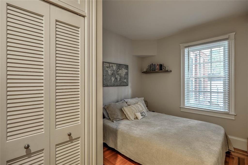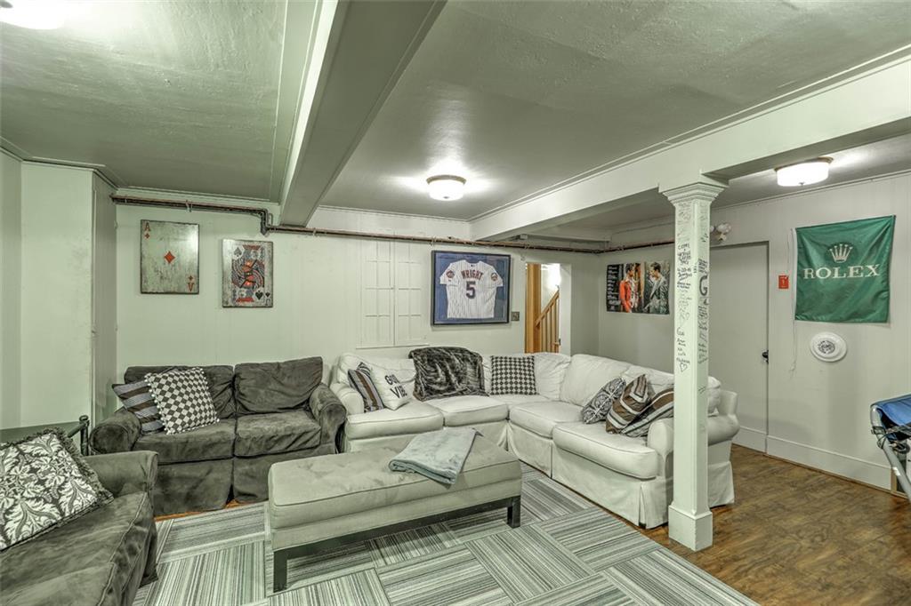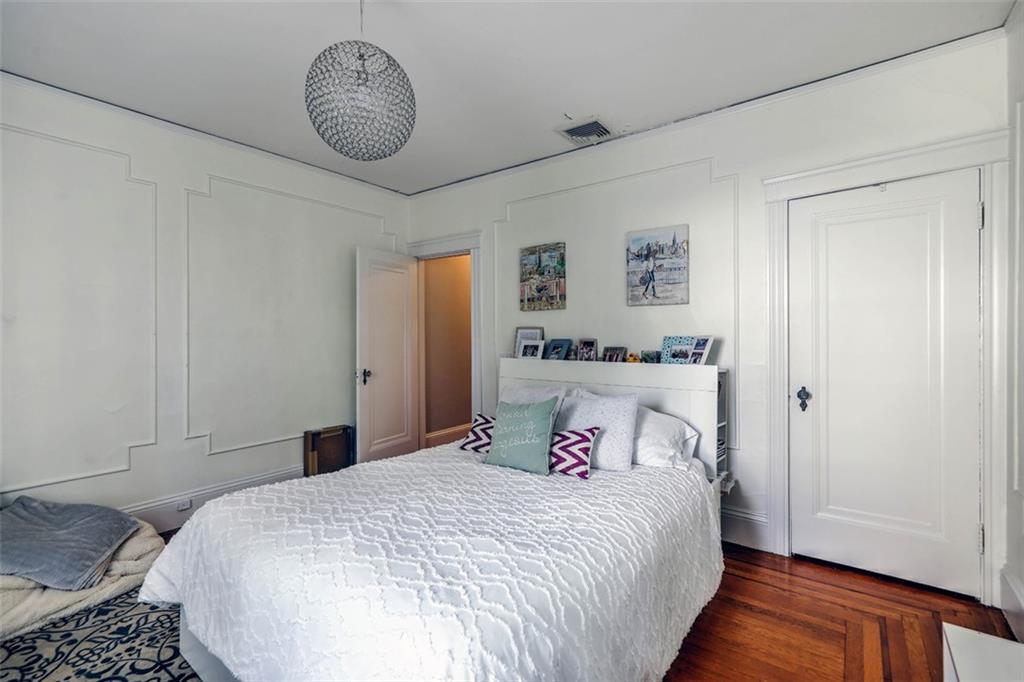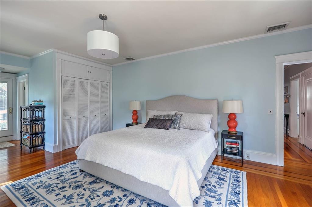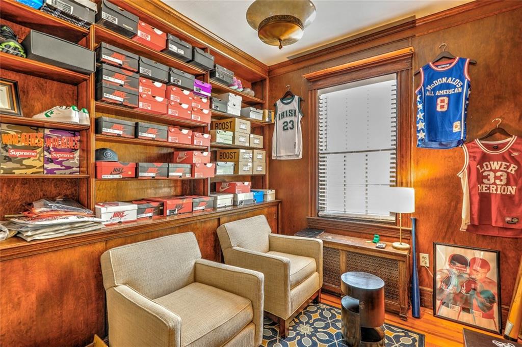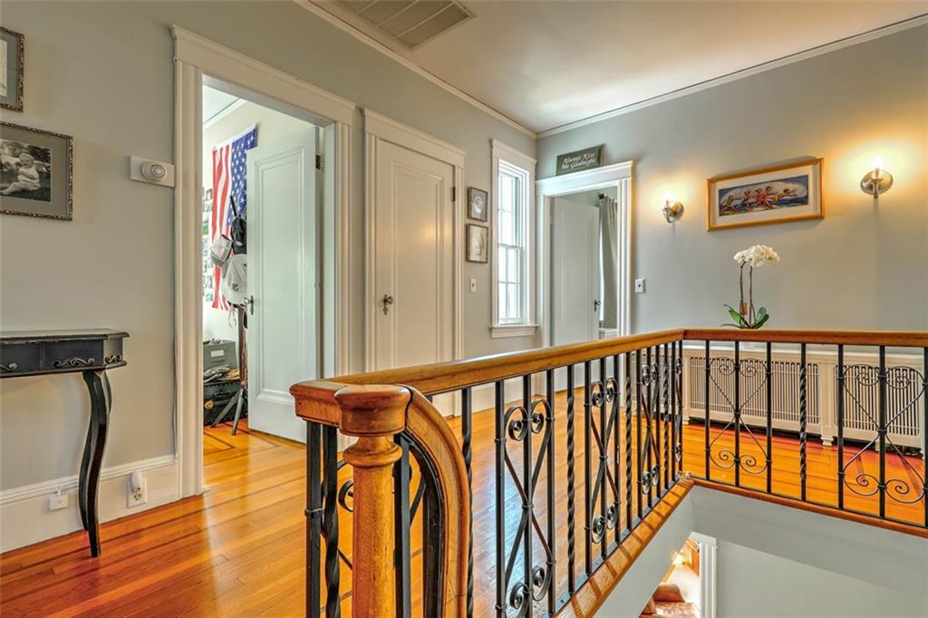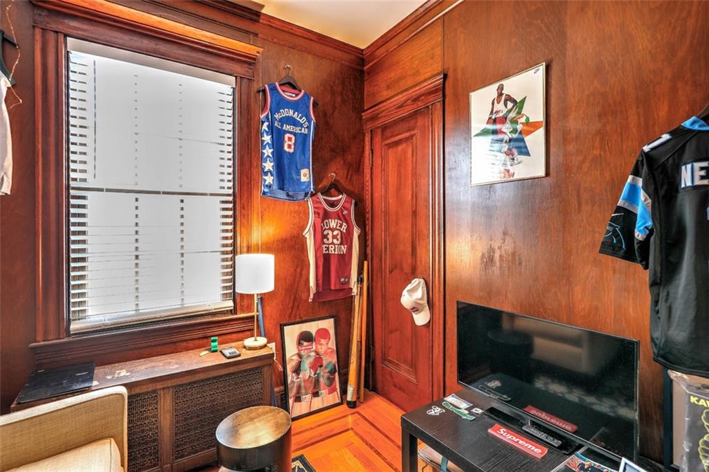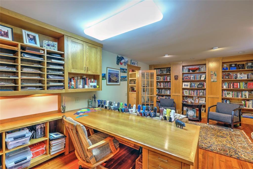 Located on Abbottsford Court, a quiet and very desirable street in Freeman Plat, this stately home is situated high on its corner lot, offering privacy and park-like views, and is enhanced by its unique layout and great flow. Hardwood floors, high ceilings, and original moldings add to the charm of this home. On the first floor, the large living room with fireplace has an adjoining office beautifully covered in grass cloth, which could also be used as a more casual family room or home office. Off the main foyer to the right, the light-filled dining room adjoins the kitchen and provides ample dining seating.