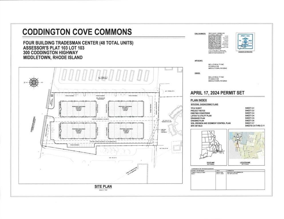Coddington Cove Commons – Building #2 Unit #206 – Modern business and storage complex with state-of-the-art amenities to address the specific needs of small business owners’ craftspeople, marine trades people, artists and general trades people. Coddington Cove Commons is ideally situated on 3.86 acres with easy access to the Middletown Corporate and industrial parks, the Newport Pell Bridge, the Newport Marine Industry, Naval Station Newport and a wide range of local businesses. The current design features four individual and customizable 14,400 square foot buildings. The open architecture will allow early purchasers the flexibility for various configurations.
