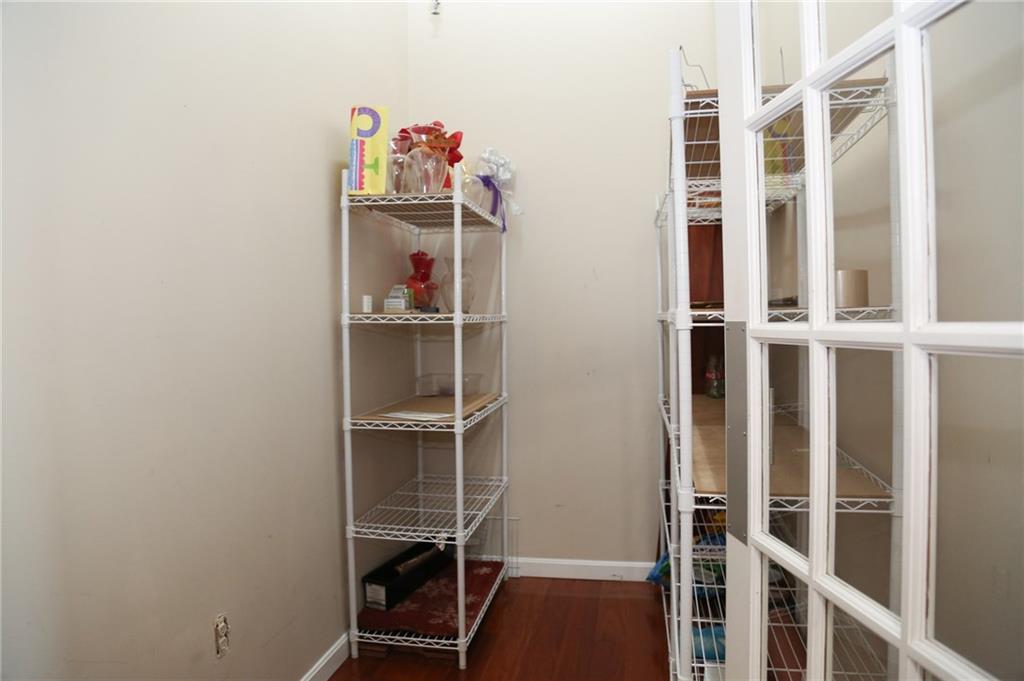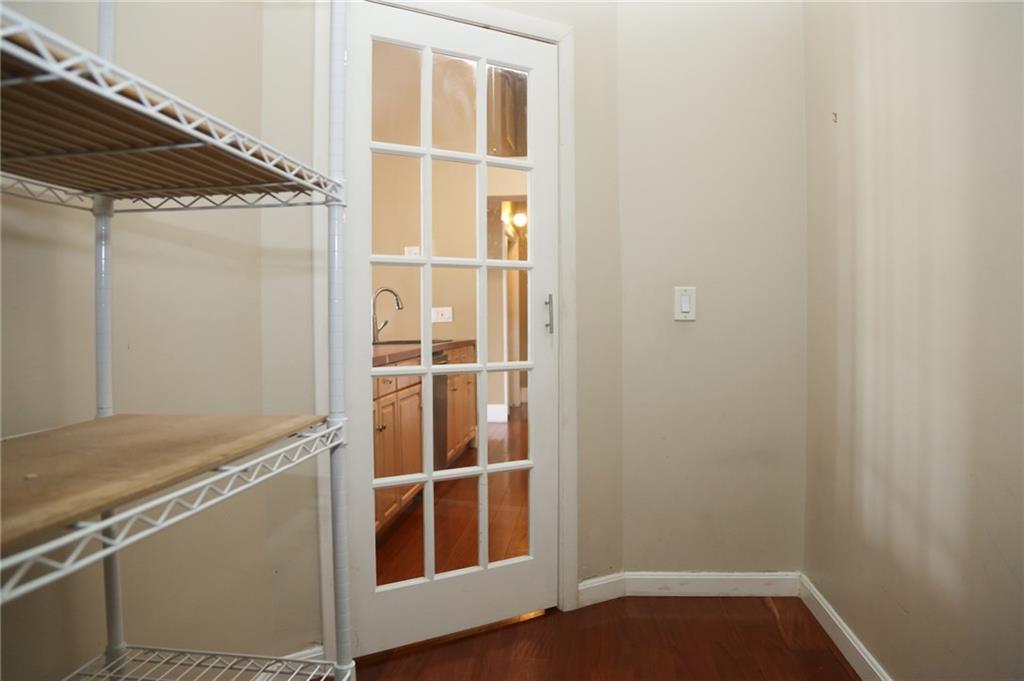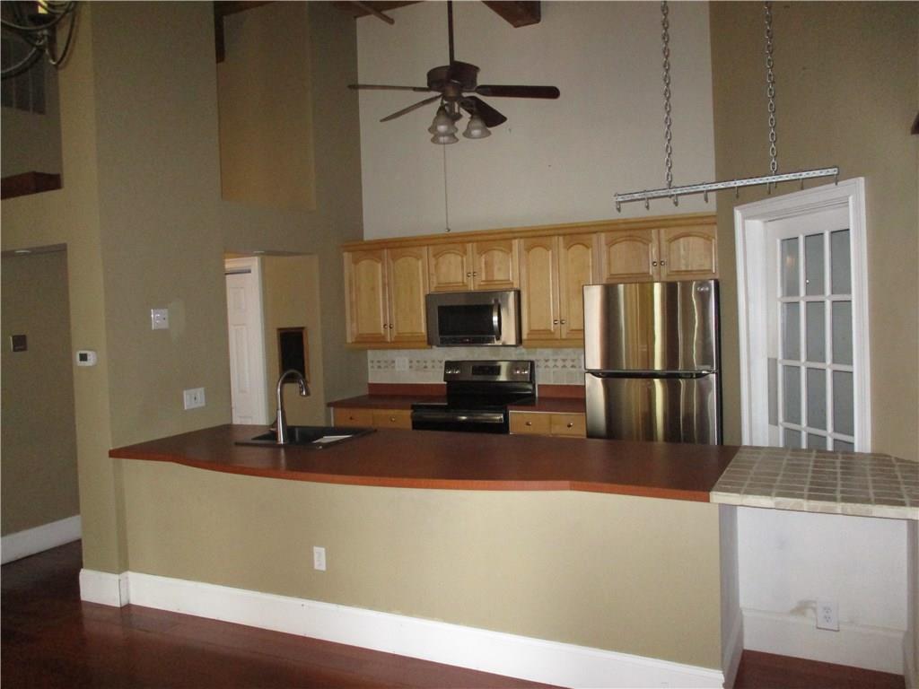 The galley kitchen features stainless appliances and a large breakfast bar. It also has a large pantry/storage room.