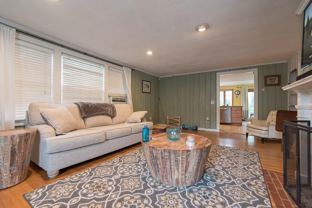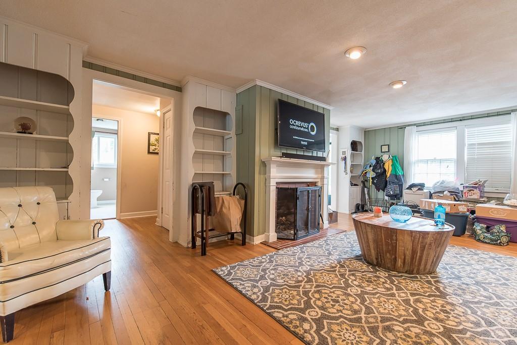 room with fireplace, built in bookshelves and hardwood flooring that extends throughout most of the first floor. Off the living room,