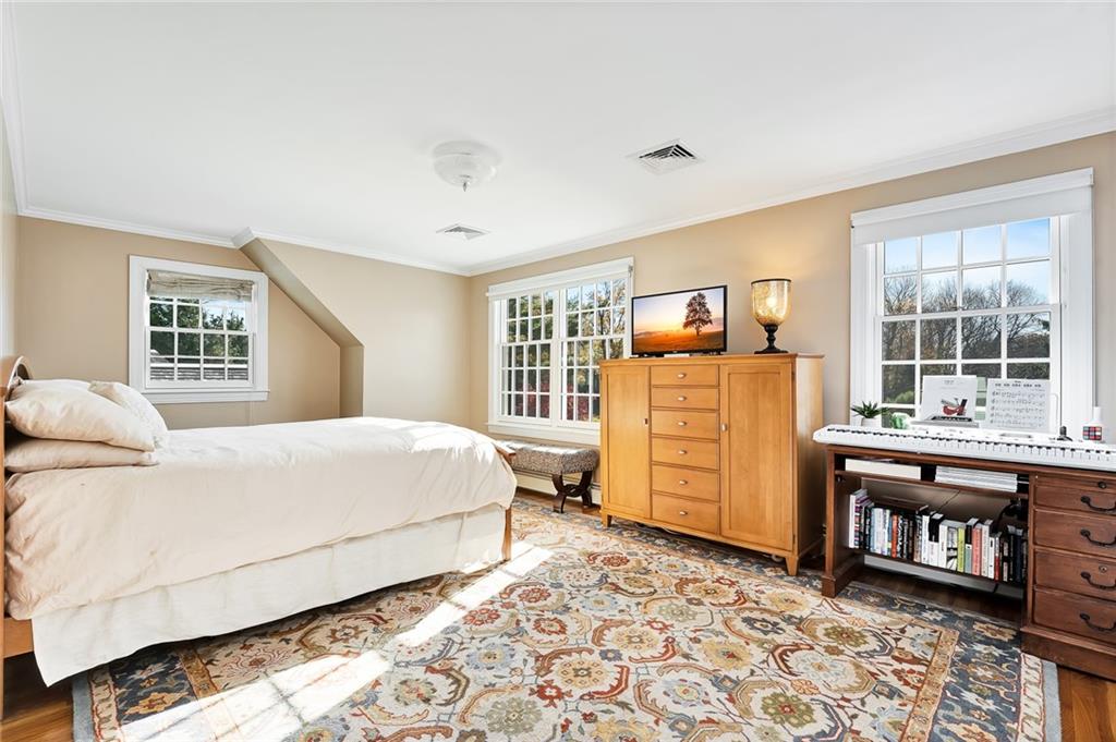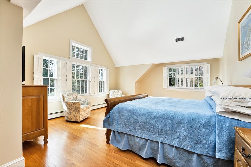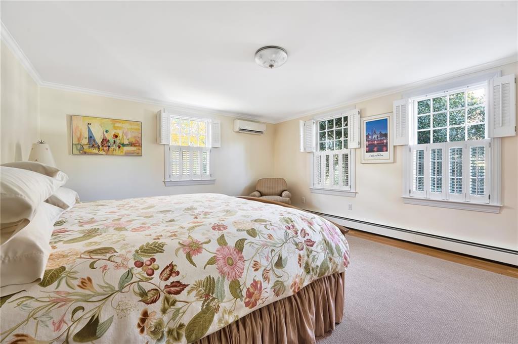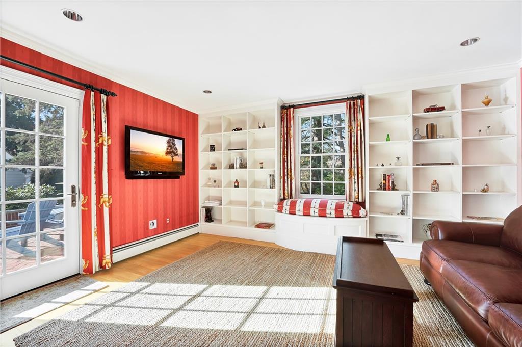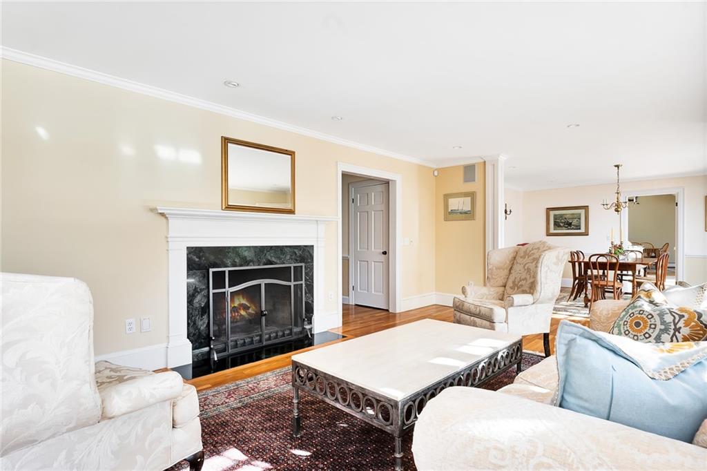 Quintessential New England style at its finest! Situated on 1.5 private and pristine acres on beautiful Adams Point, this 4-bedroom, wood shingled Cape Cod boasts craftsmanship, elegant conveniences, and total serenity. The first floor includes an eat-in chef’s kitchen with granite countertops and stainless steel appliances which opens into a welcoming and cozy family room. The dining room is on the other side of the kitchen, and flows seamlessly to the living room, which is ideal for gathering and entertaining. An office and library are also on the first floor, as well as a guest suite that can easily be a first floor primary bedroom if one prefers it.
