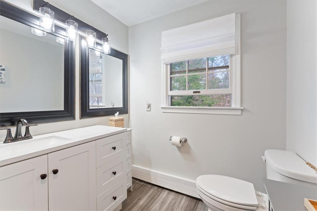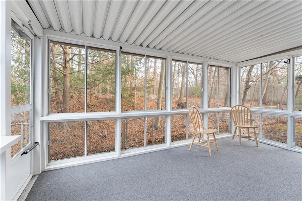 Enjoy serene woodland views from the three-season porch—a relaxing spot to entertain or unwind. Upstairs, four generous bedrooms and two updated baths await, including a private primary ensuite with walk-in shower. The family-friendly hall bath features a double vanity and stylish finishes.