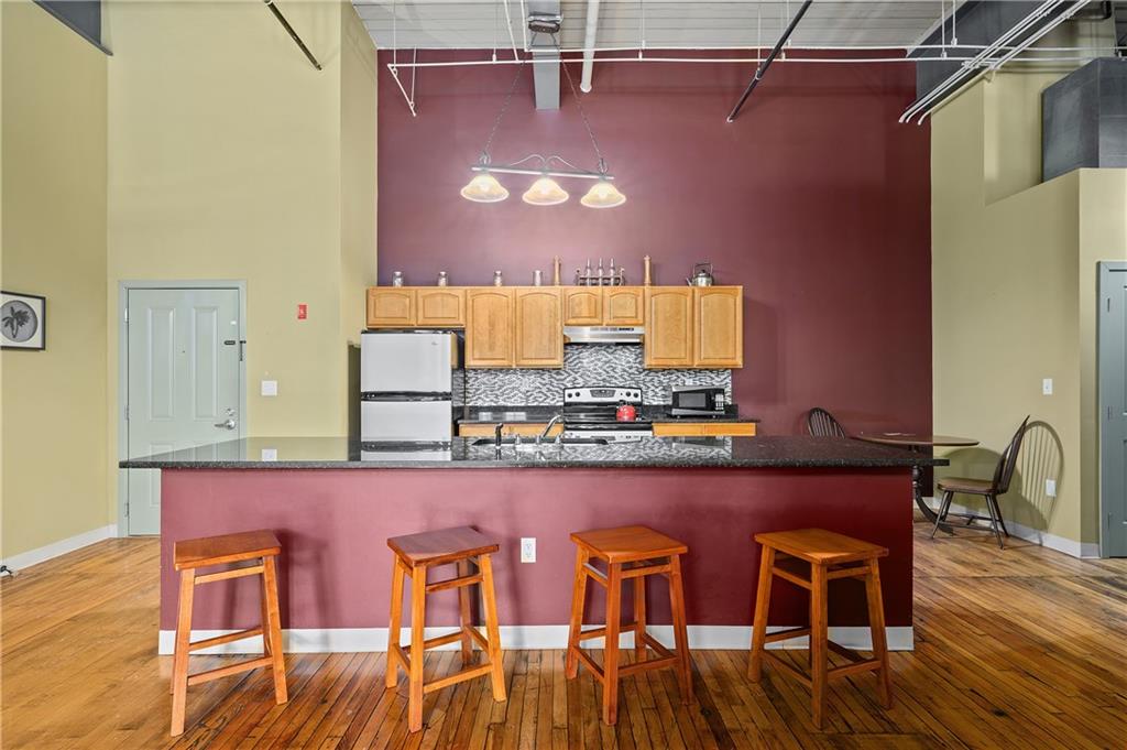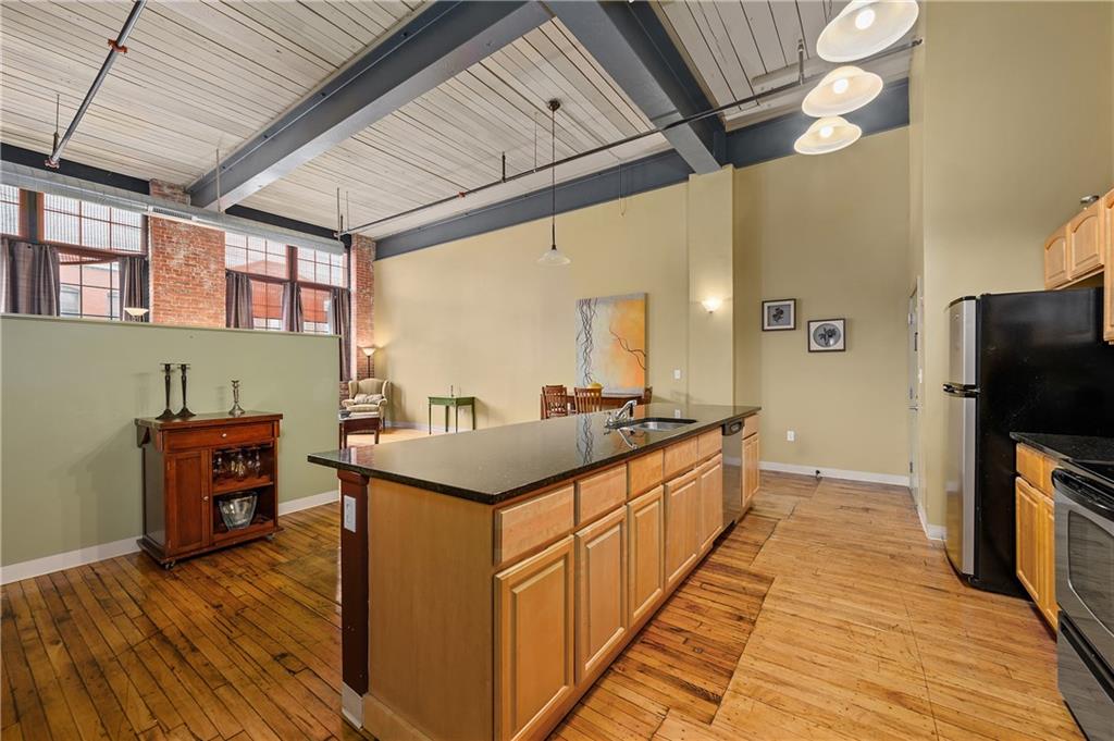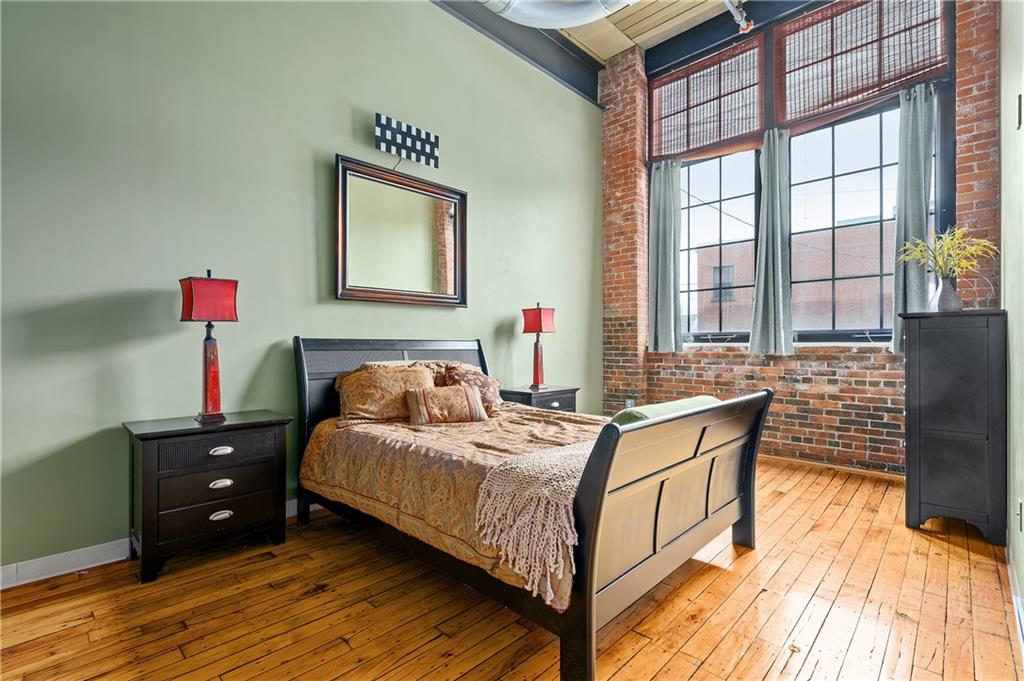 Beautiful first floor loft condo at Gateway Commons being offered fully furnished. Truly move-in condition!! This 1,314sq’ condo has an amazing open floorplan with distressed hardwood flooring throughout, soaring 15′ ceiling heights with exposed beams and ductwork, exposed brick walls, a huge, open kitchen with massive island for entertaining, a spacious master suite with full bath plus another full bath and semi-private second bedroom area that makes a great home office or den. The condo includes central air conditioning, gas heat, laundry connections within the unit, parking for two vehicles and huge deeded storage space in the basement. Condo fees include water and sewer.