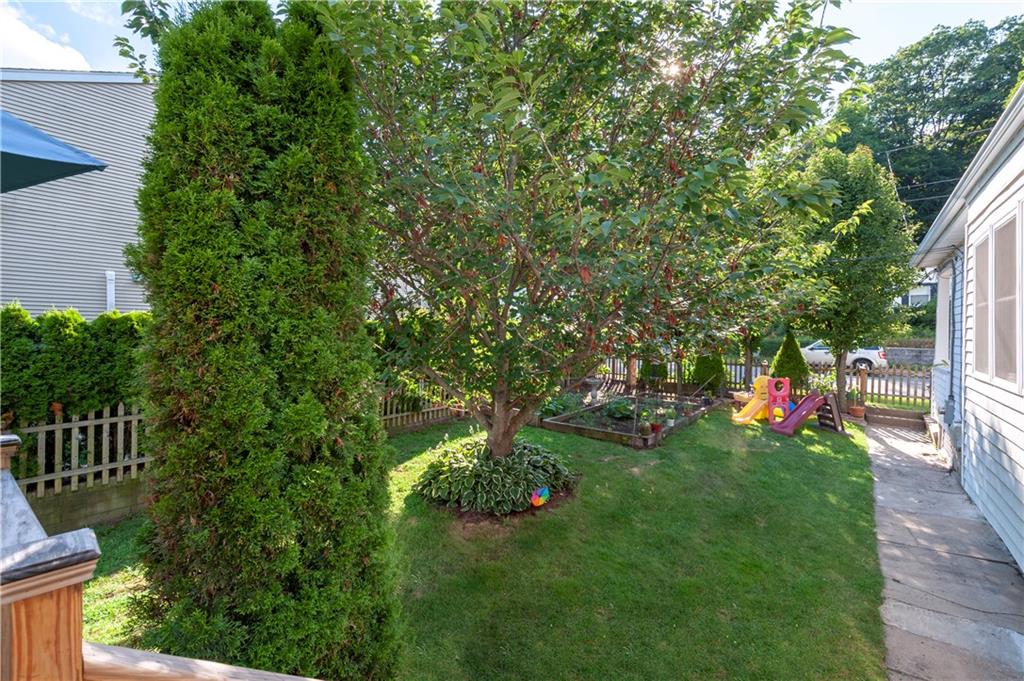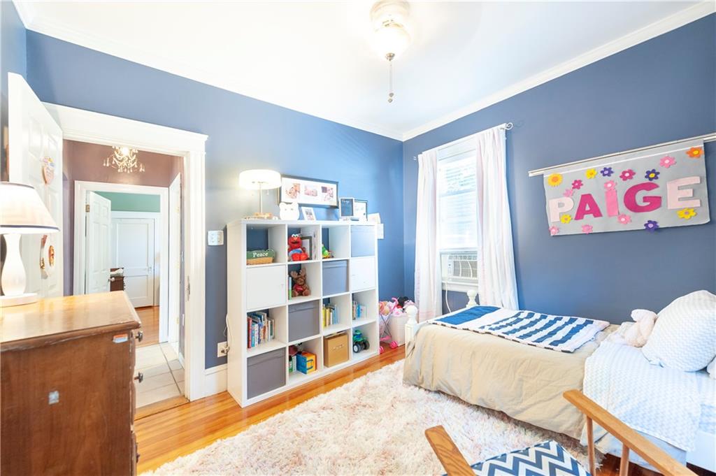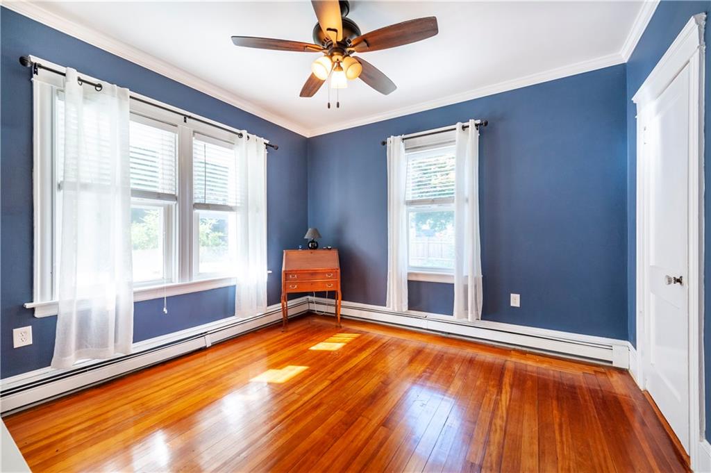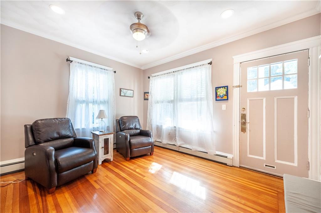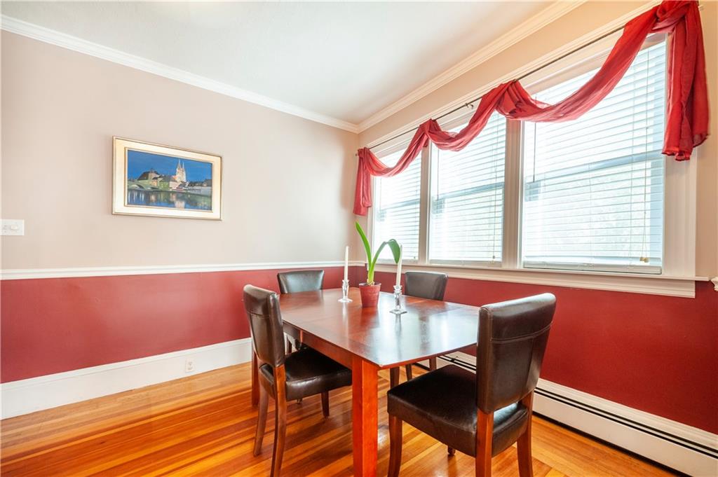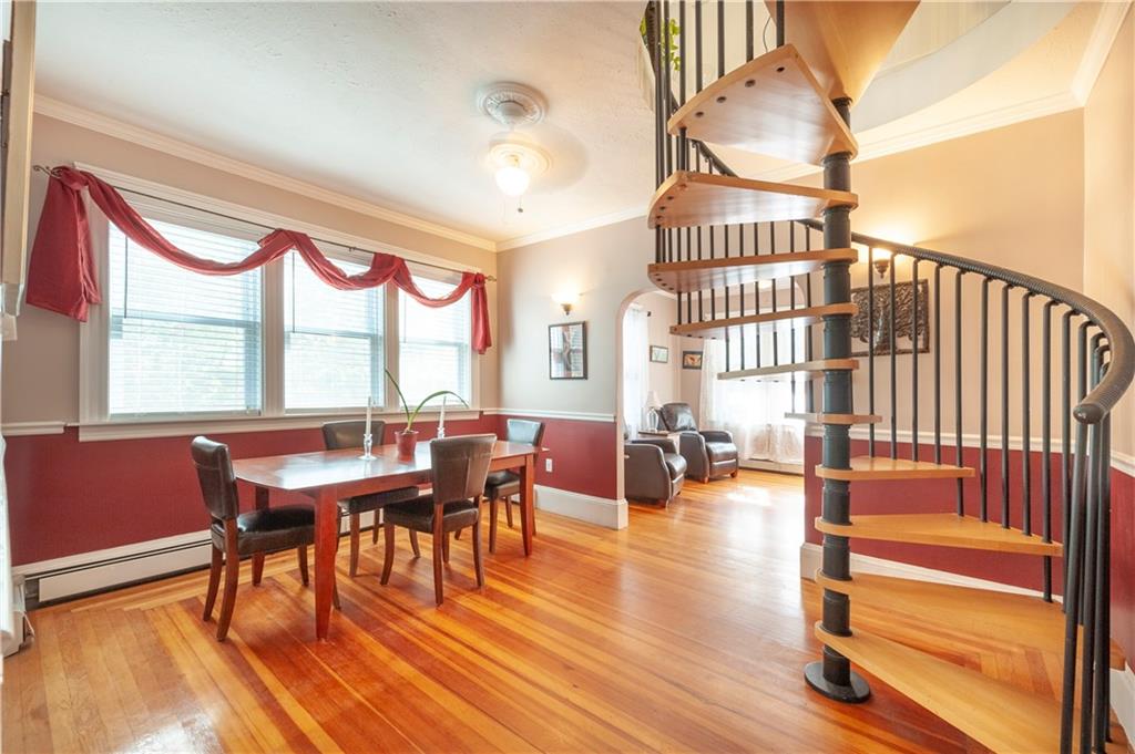 A very spacious four bedroom one and half bath Bungalow in desirable Elmhurst neighborhood of Providence. Spiral staircase that leads to a full Master Suite with skylights, lavette/w skylight, walk in closet and recessed lighting. This home also features crown moldings, cedar closet, hardwoods, eat in kitchen/W island, tile floor, recessed lighting and a deck with a gas line to hook up to your grill (deck installed in 2017) off the kitchen to enjoy cook outs. Roof installed in 2011 with one layer, replacement windows, vinyl siding, new hot water tank installed in 2017, new furnace installed in 2016 with three zones and 200 amp service.