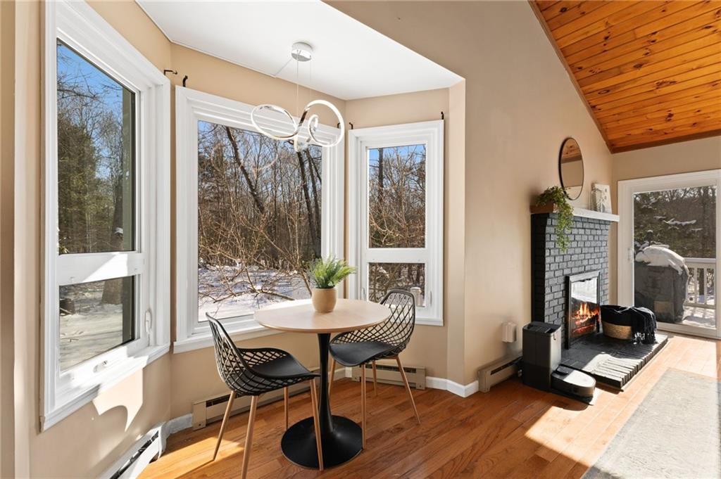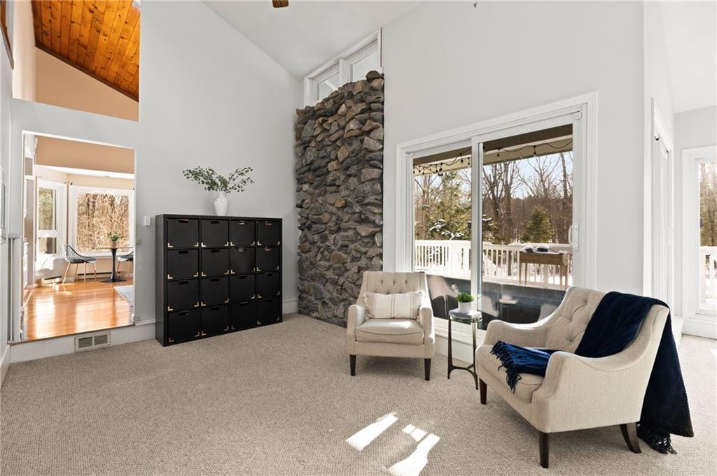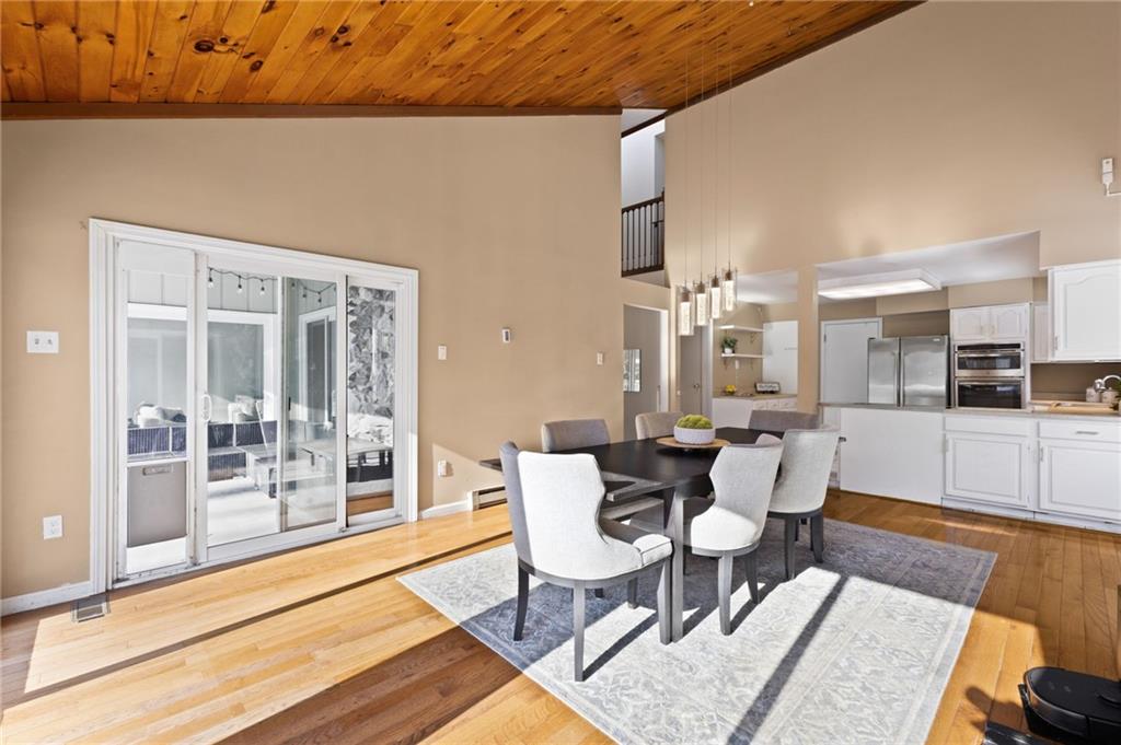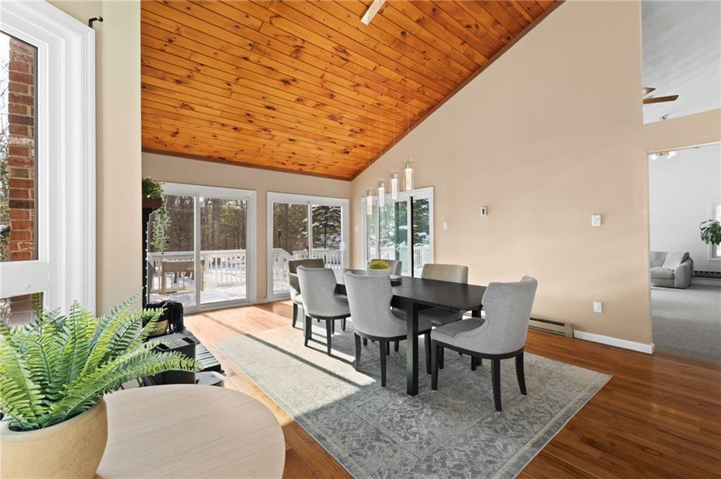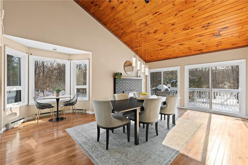 Nestled on 13 acres of picturesque land, this remarkable contemporary home offers both privacy & elegance. The open-concept kitchen flows seamlessly into the fireplaced dining room, creating the perfect space for family gatherings and entertaining. With soaring ceilings & hardwood floors, This space is designed for comfortable living and stylish entertaining. Sliding doors lead from the dining room to a private backyard with a deck—ideal for outdoor dining and relaxation.