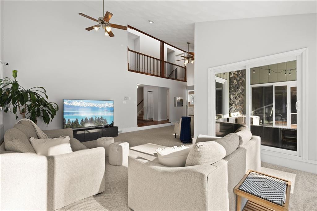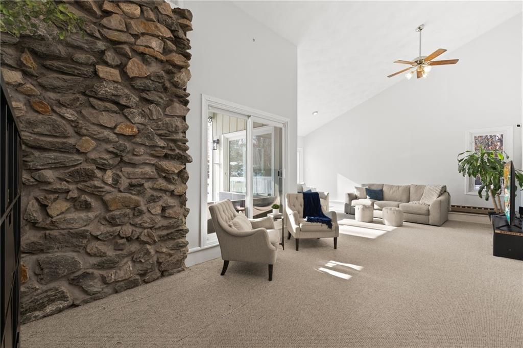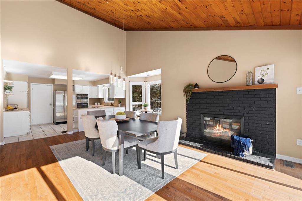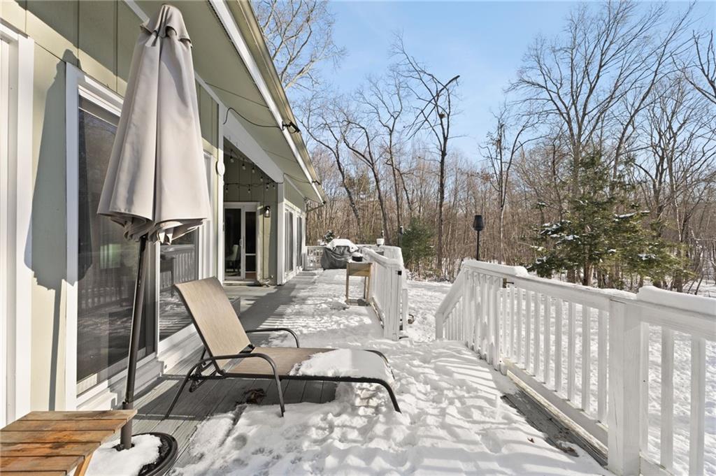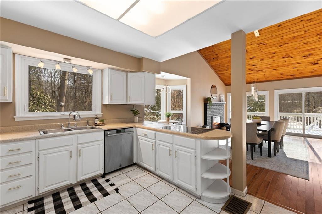 Nestled on 13 acres of picturesque land, this remarkable contemporary home offers both privacy & elegance. The open-concept kitchen flows seamlessly into the fireplaced dining room, creating the perfect space for family gatherings and entertaining. With soaring ceilings & hardwood floors, This space is designed for comfortable living and stylish entertaining. Sliding doors lead from the dining room to a private backyard with a deck—ideal for outdoor dining and relaxation.