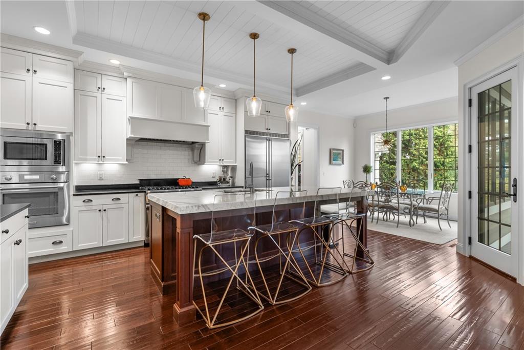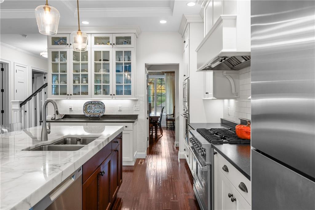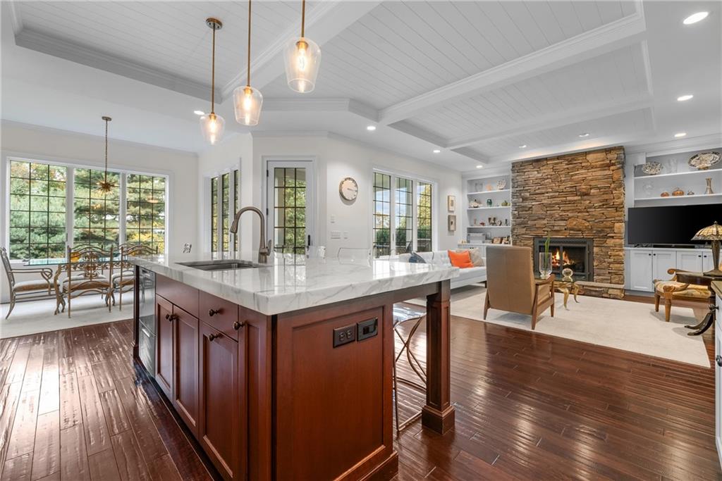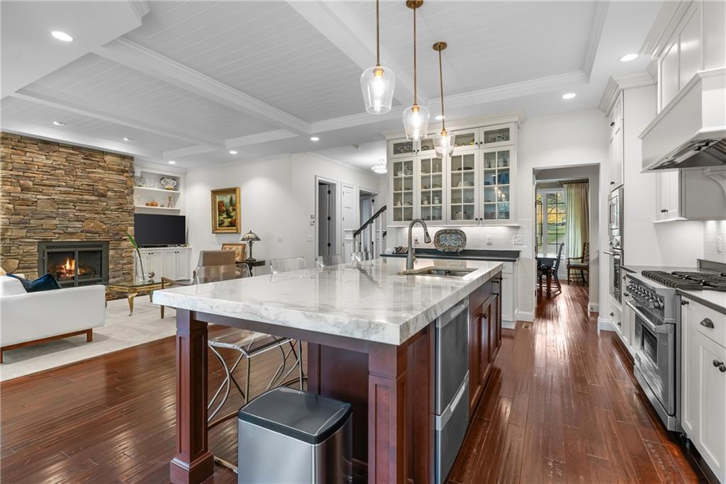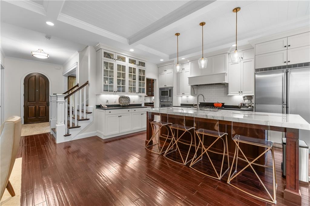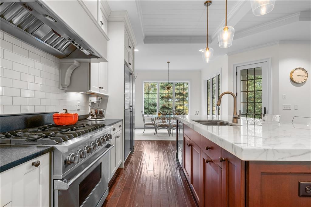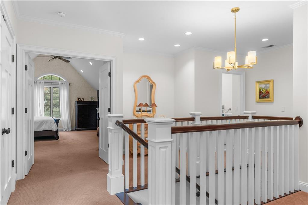 plan, highlighted by the fully finished walkout lower level, perfect for a variety of uses, from a family room to a guest suite. The main living areas flow seamlessly, providing both comfort and functionality. An open upper loft area offers an ideal space for a home office, enhancing the home’s versatility. Ornate detailing throughout the home is a testament to its craftsmanship, featuring 10-foot coffered ceilings and rounded door frames. The gourmet kitchen is a chef’s dream, showcasing marble countertops, stainless steel appliances-including a Liebherr refrigerator, dual ovens, and a six-burner cooktop. The expansive property frontage creates a stately yet approachable impression, inviting you to explore the beautifully landscaped grounds. This home truly offers a remarkable lifestyle where comfort meets sophistication. Don’t miss your chance to own this exceptional property!