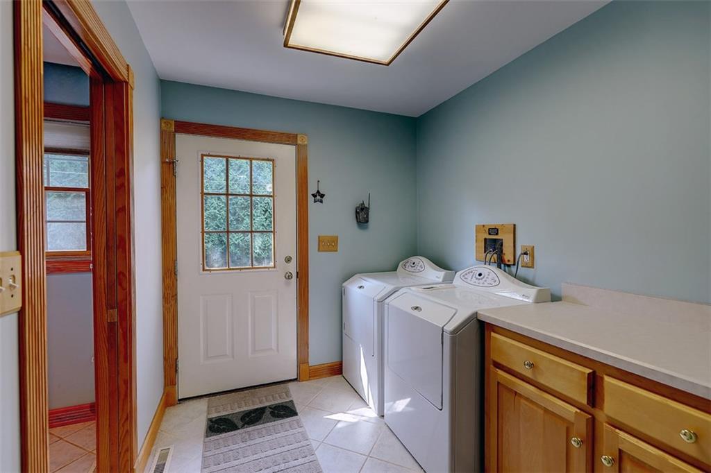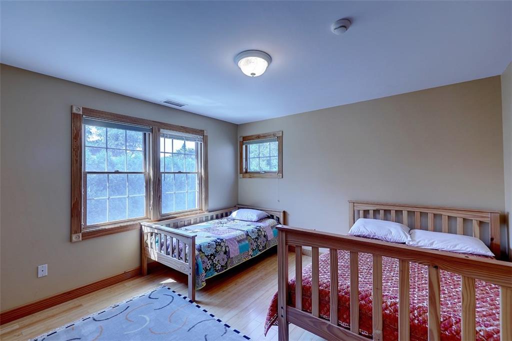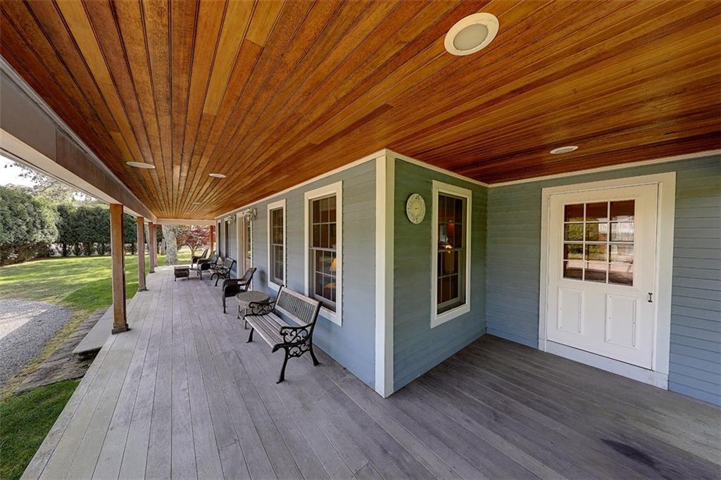 Master-sized bedroom on first floor, lavette, laundry, and mudroom complete main level living. Master suite and two other large bedrooms have lots of closet space and many built-ins. Lower level has significantly finished space for game or rec room type uses. Central air, and vac, security system, and upgraded mechanical systems. Mahogany decking and outside shower too, on a level 1/2 acre with nicely hedged perimeter.