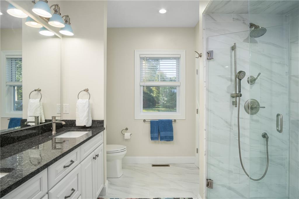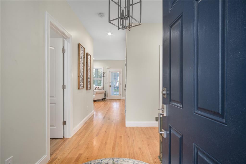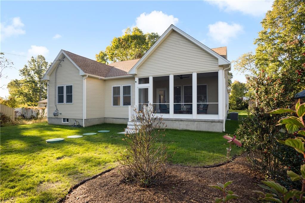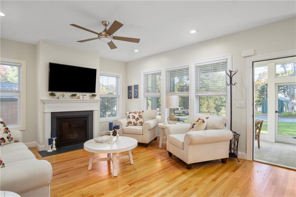 Gleaming hardwoods, high ceilings, and natural light flood the entire home, with beautiful windows boasting the incredible view. The bright kitchen has a large island, stunning cabinetry and granite, pantry closet, and stainless appliances – of mention, a double oven, cook top, and side by side refrigerator. All this, coupled with an open flow into the dining and living room with fireplace, make this home perfect for entertaining guests or spending relaxing nights at home. A primary bedroom with walk-in closet and an ensuite bathroom with double sinks, a big linen closet and a stunning oversized shower. Two extra bedrooms on the opposite side of the house provide an even more spacious feel. The home has ease of living with its vinyl siding, central air, new septic and utilities, and pre-wiring for a generator. Close proximity to water access, marinas, highway, beaches, and area restaurants. Very few homes like this available in this desirable location of Rhode Island; a perfect primary or second home!